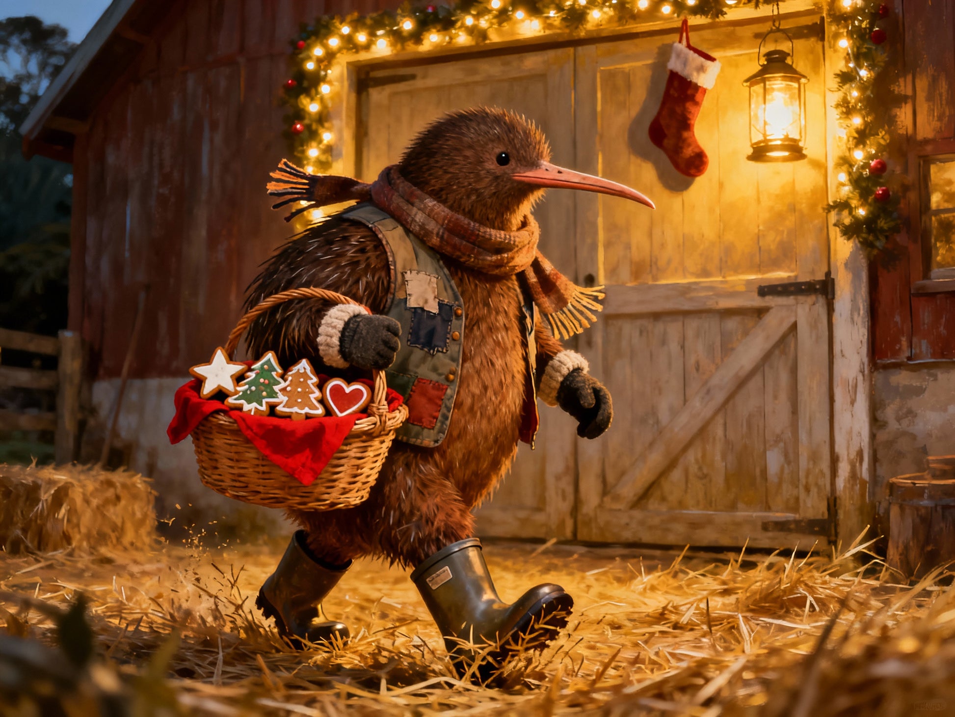 A warm New Zealand Christmas card featuring Farmer Bracken, the round kiwi bird farmer, striding through the barnyard with a basket full of festive biscuits. The barn glows with twinkling lights, garlands, and a hanging stocking, while the lantern shines softly, capturing the rustic magic of holiday giving.