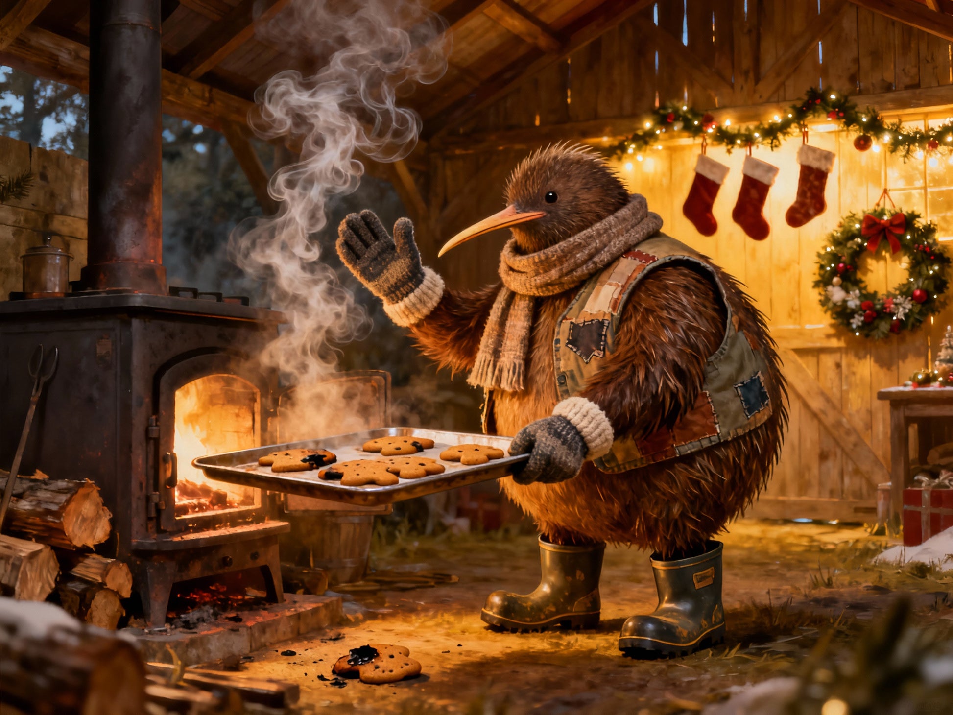 A whimsical holiday card featuring Farmer Bracken, the round kiwi bird farmer, proudly pulling a tray of cookies from the woodstove in his rustic barn. Dressed in his patched vest, scarf, and gumboots, he waves his oven-mitt wing at the smoke as a few burnt biscuits tumble to the floor. A humorous New Zealand Christmas scene full of charm and warmth.