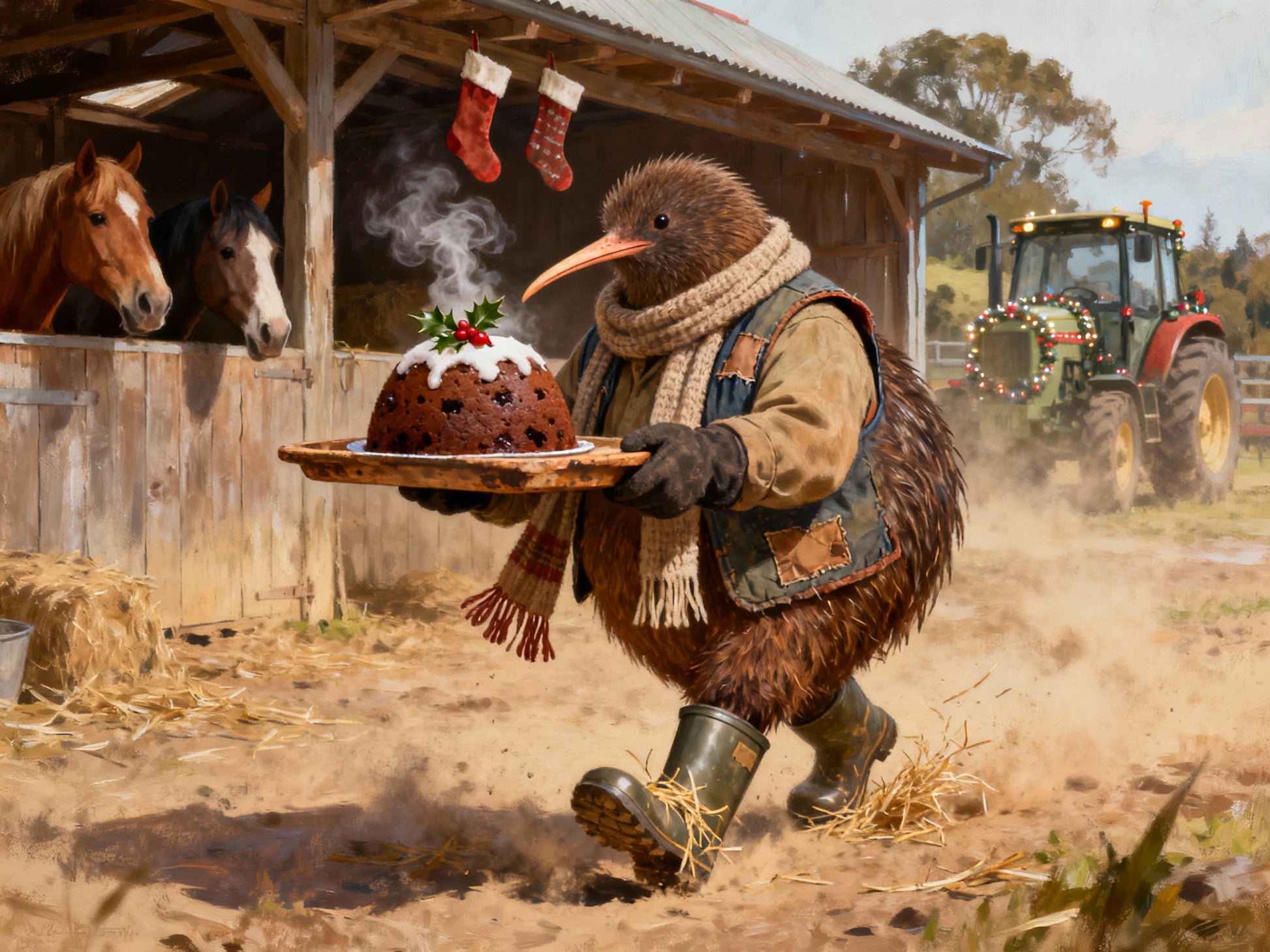 A festive New Zealand Christmas card featuring Farmer Bracken, the round kiwi bird farmer, proudly carrying a steaming Christmas pudding topped with holly. Dressed in his patched vest, scarf, and gumboots, he walks briskly past the stables where horses peek out curiously. In the background, a decorated tractor adds holiday sparkle to the rustic farmyard. A heartwarming rural holiday scene full of tradition and charm.