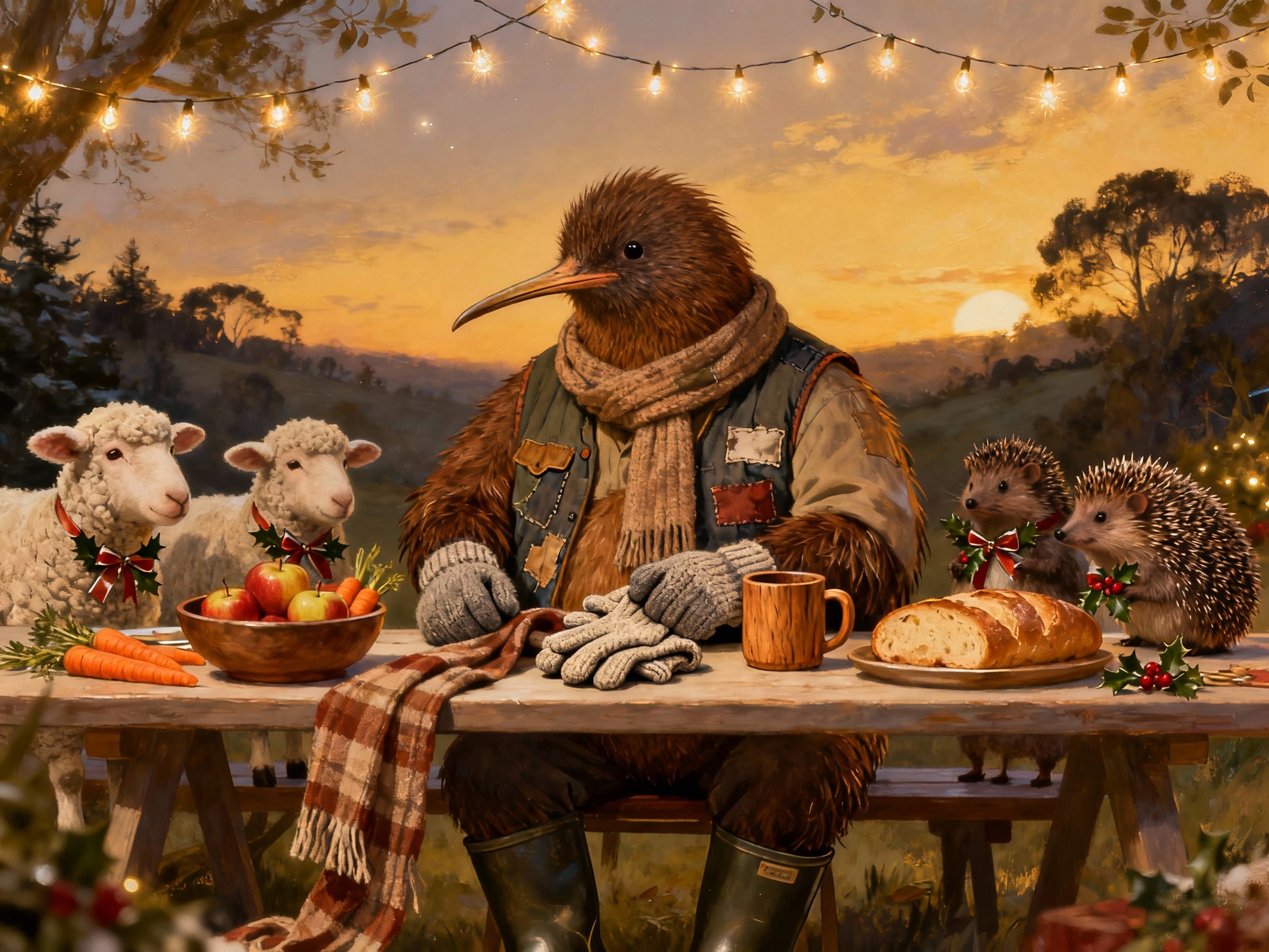 A whimsical New Zealand Christmas card featuring Farmer Bracken sitting at a rustic outdoor table at sunset, surrounded by sheep and hedgehogs with festive holly collars. A spread of apples, carrots, and freshly baked bread captures the warmth of a countryside holiday feast under glowing string lights. Printed on premium matte card stock and blank inside for your own message.