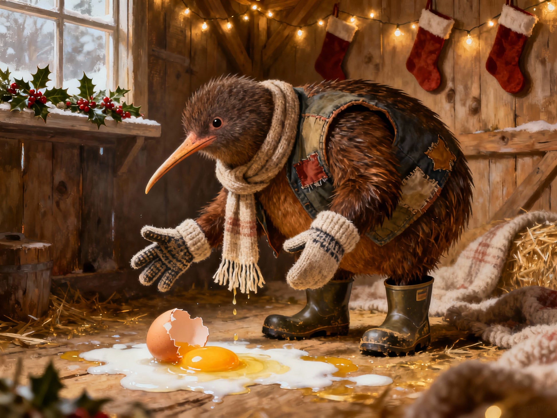 A whimsical holiday card showing Farmer Bracken the kiwi bird farmer in his rustic barn, wearing his patched vest, scarf, gloves, and gumboots. He looks down in surprise at a broken egg spilled on the straw-covered wooden floor, yolk spreading across the boards. Christmas stockings hang on the barn wall, fairy lights twinkle above, and holly brightens the frosty window, creating a humorous and festive New Zealand farmyard scene.