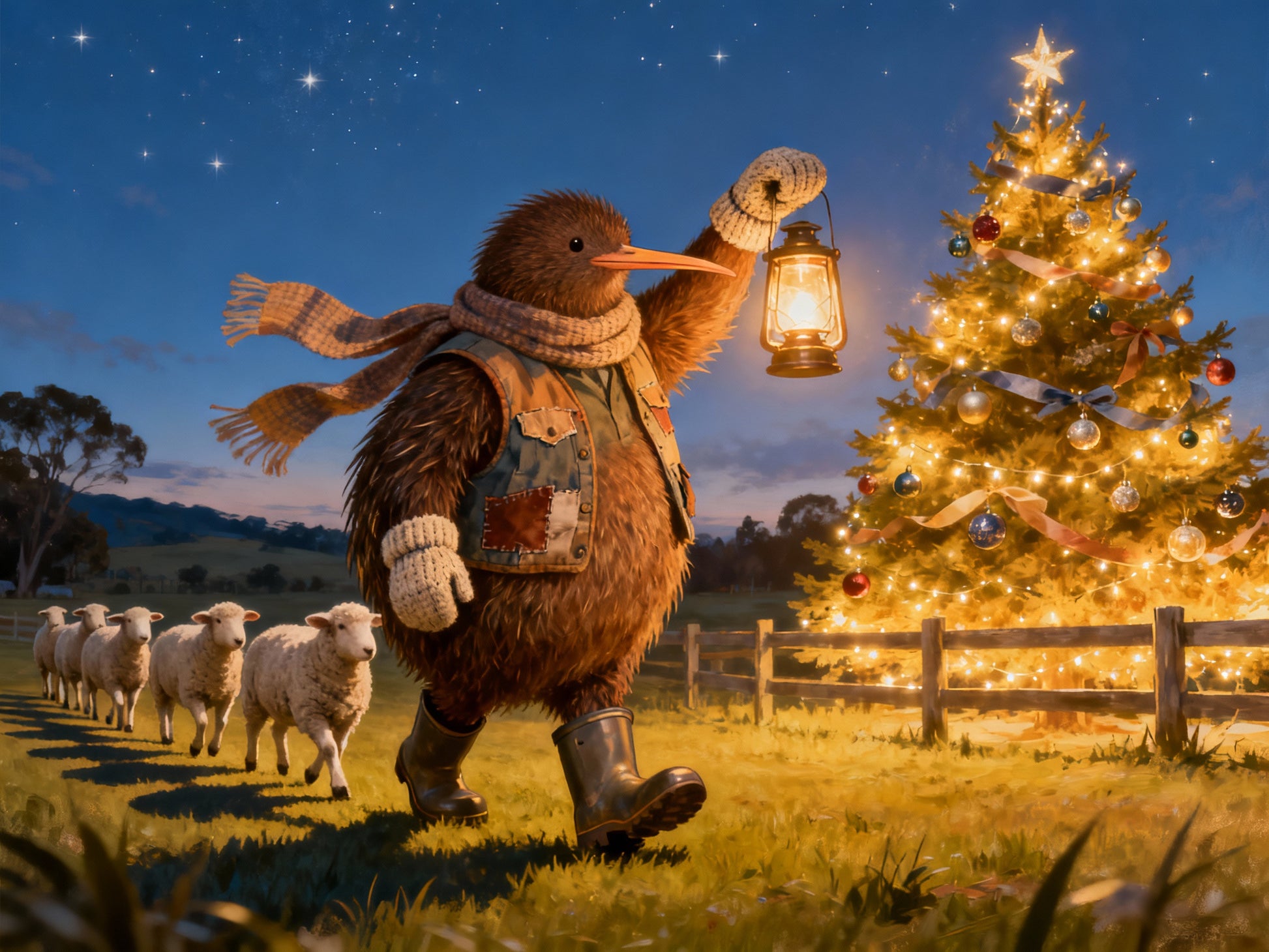 A magical Christmas card of Farmer Bracken leading his flock by lantern light. Dressed in his patched vest, scarf, and gumboots, Bracken holds a glowing lantern high as sheep follow in a gentle line. To his side, a Christmas tree sparkles with golden lights and baubles under the night sky. A warm, rustic celebration of New Zealand’s countryside Christmas.