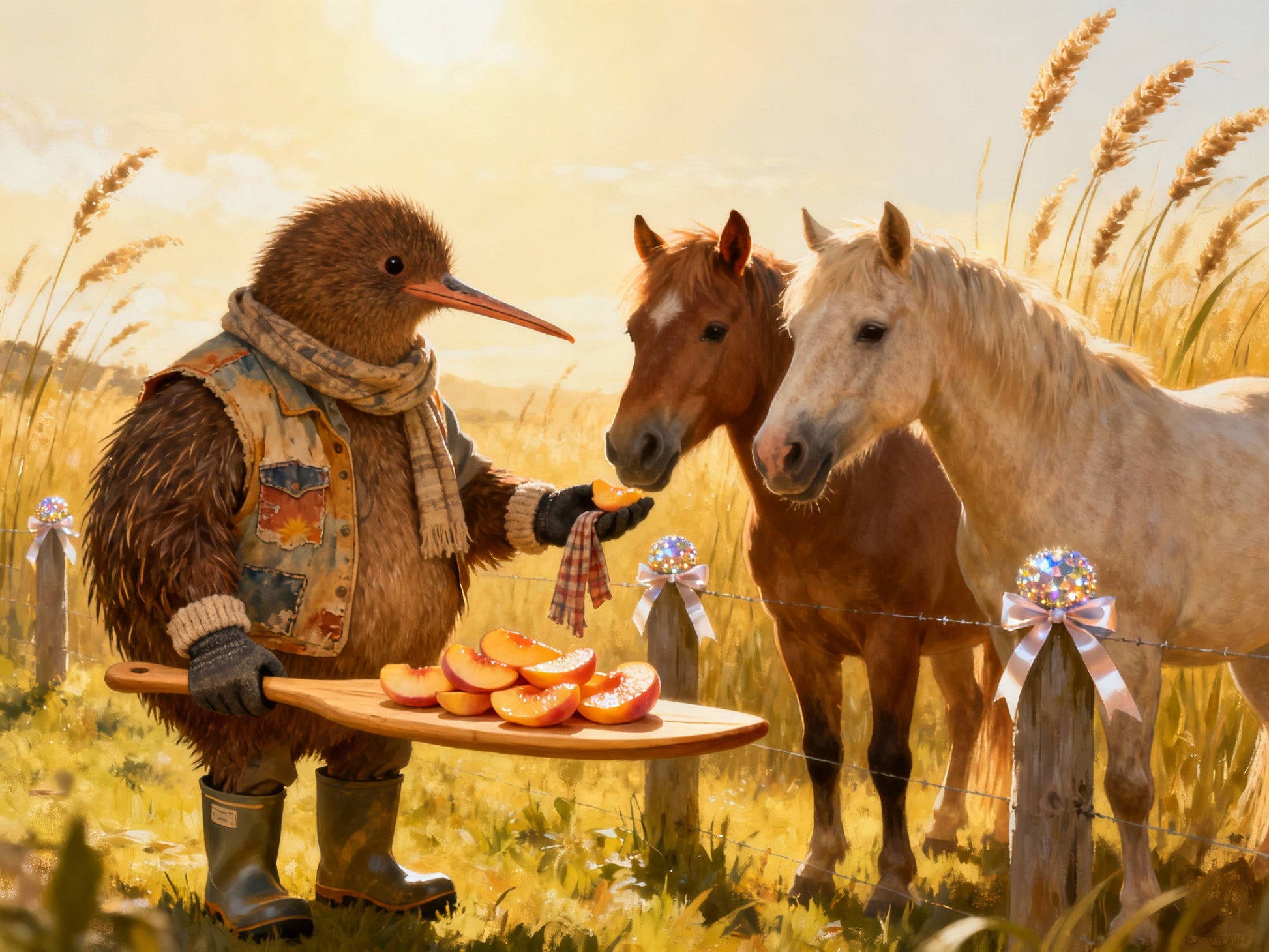 A heartwarming Christmas card of Farmer Bracken sharing summer fruit with two friendly horses. Wearing his patched vest, scarf, and gumboots, Bracken offers bright slices of peaches from a rustic wooden board. The horses lean over a decorated fence with festive ribbons, set against golden fields glowing in the evening sun. A cheerful celebration of kindness and rural life in New Zealand at Christmas.