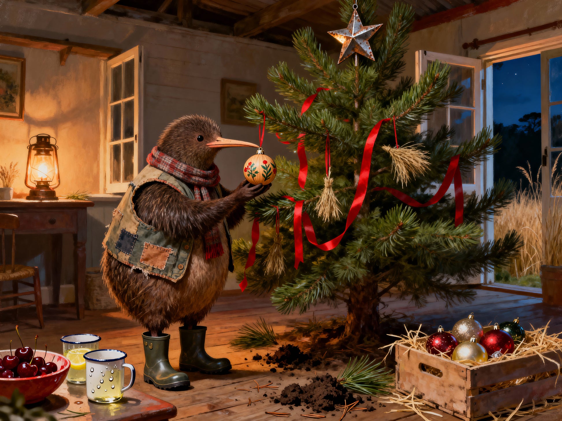 A cozy Christmas card of Farmer Bracken decorating his tree in a rustic farmhouse. Wearing his patched vest, scarf, and gumboots, he carefully hangs a painted bauble on the fresh pine tree, its roots still resting on the wooden floor. Red ribbons, straw ornaments, and a shining star crown the tree, while lantern light glows warmly through open windows onto the summer fields outside. A perfect blend of New Zealand’s countryside charm and festive cheer.
