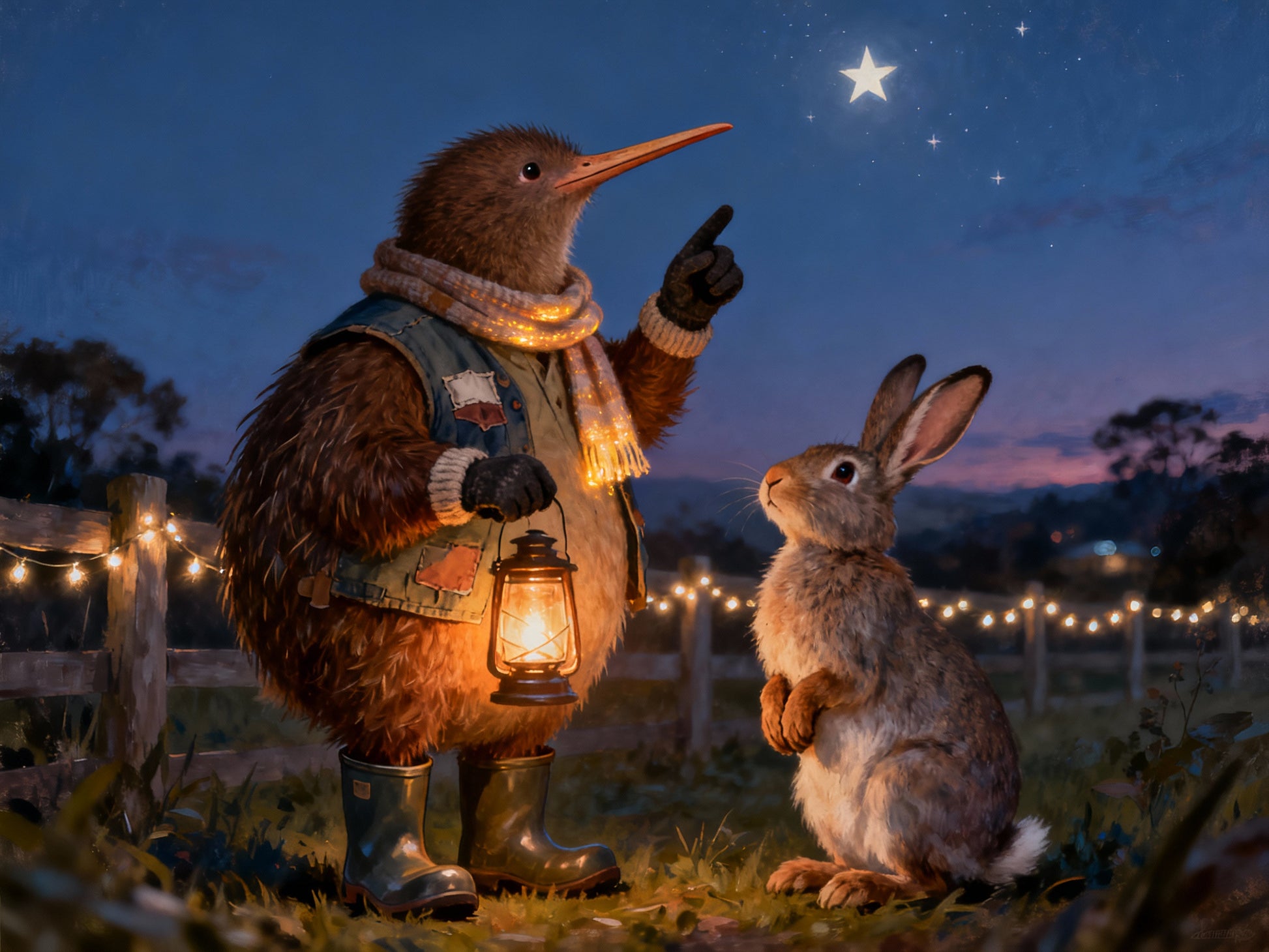 A tender Christmas card of Farmer Bracken pointing to a shining star in the night sky. Holding a lantern, dressed in his patched vest, scarf, and gumboots, Bracken stands beside a rabbit who gazes up in wonder. Festive lights twinkle along the fence behind them, as the sky glows deep blue with a single bright star leading the way. A rustic and heartwarming New Zealand Christmas moment.
