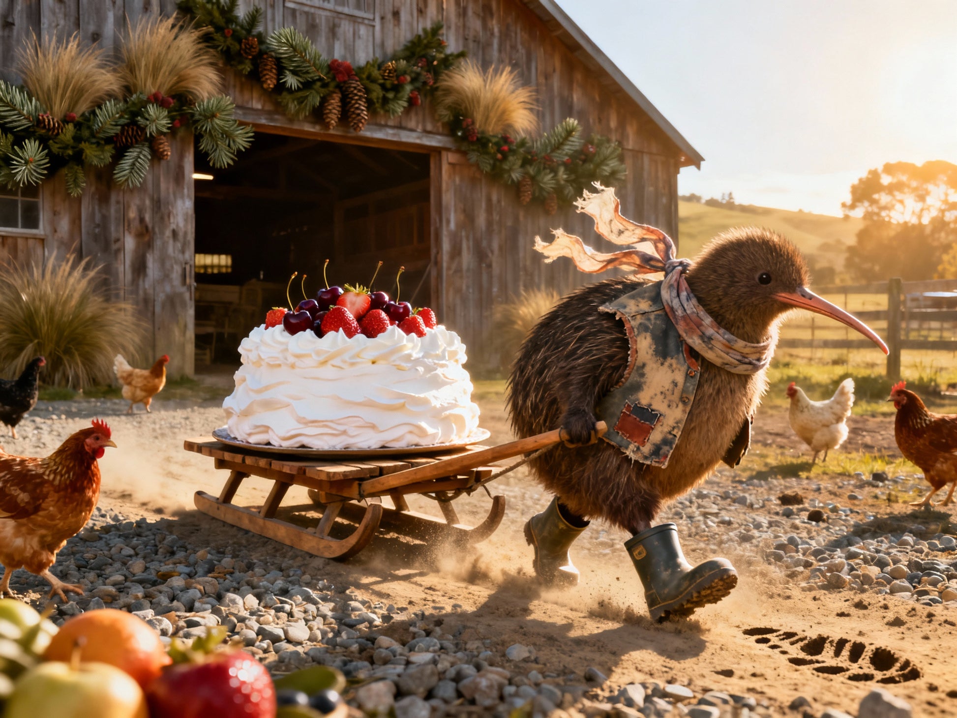 A joyful Christmas card of Farmer Bracken pulling a sled piled high with a festive pavlova, topped with fresh berries and cherries. Wearing his patched vest, scarf, and gumboots, Bracken strides proudly past the barn, decorated with garlands of pinecones and greenery. Chickens scatter around him in the golden summer light, capturing the spirit of a New Zealand farm Christmas.