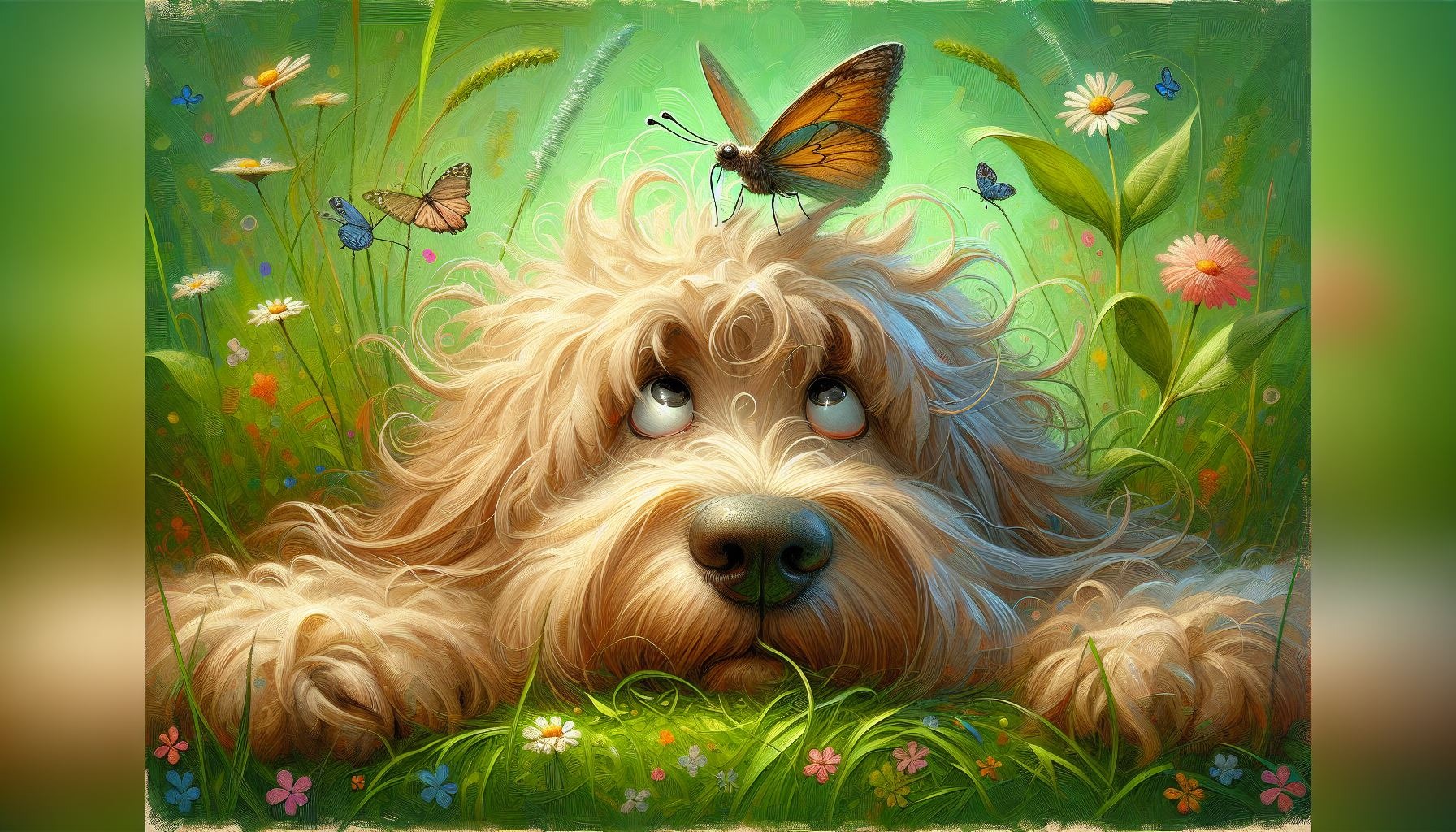 Whimsical Goldendoodle art print featuring a rustic meadow scene. This matte finish artwork captures the curly-coated dog sitting happily among tall grasses and wildflowers, a delicate butterfly perched on top of its fluffy head. Painterly detail and storybook tones highlight the doodle’s bright, joyful expression, blending rustic charm with gentle humor. Perfect for Goldendoodle lovers, whimsical décor, or collectors of playful countryside artwork.