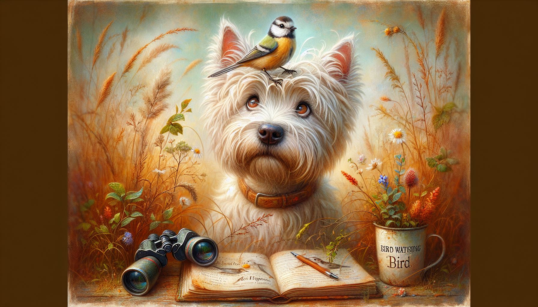 Whimsical Westie art print featuring a cheerful West Highland terrier sitting in a meadow of wildflowers with a tiny chickadee perched sweetly on his head. This matte print is painted in a rustic, painterly storybook style, capturing the Westie’s bright, expressive personality softened by the delicate charm of the little bird. Perfect wall art for dog lovers, bird enthusiasts, or anyone who enjoys whimsical and rustic animal artwork.