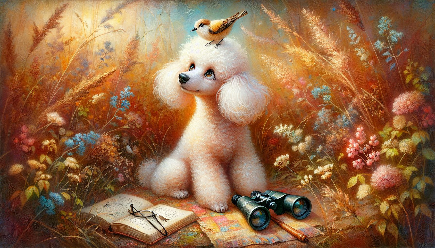 Whimsical white poodle art print featuring an elegant poodle sitting gracefully in a meadow of wildflowers with a tiny chickadee perched delicately on her head. This matte print is painted in a rustic, painterly storybook style, capturing the poodle’s refined charm paired with the playful sweetness of the little bird. A delightful wall art piece for dog lovers, bird enthusiasts, or anyone who enjoys whimsical and rustic animal artwork.