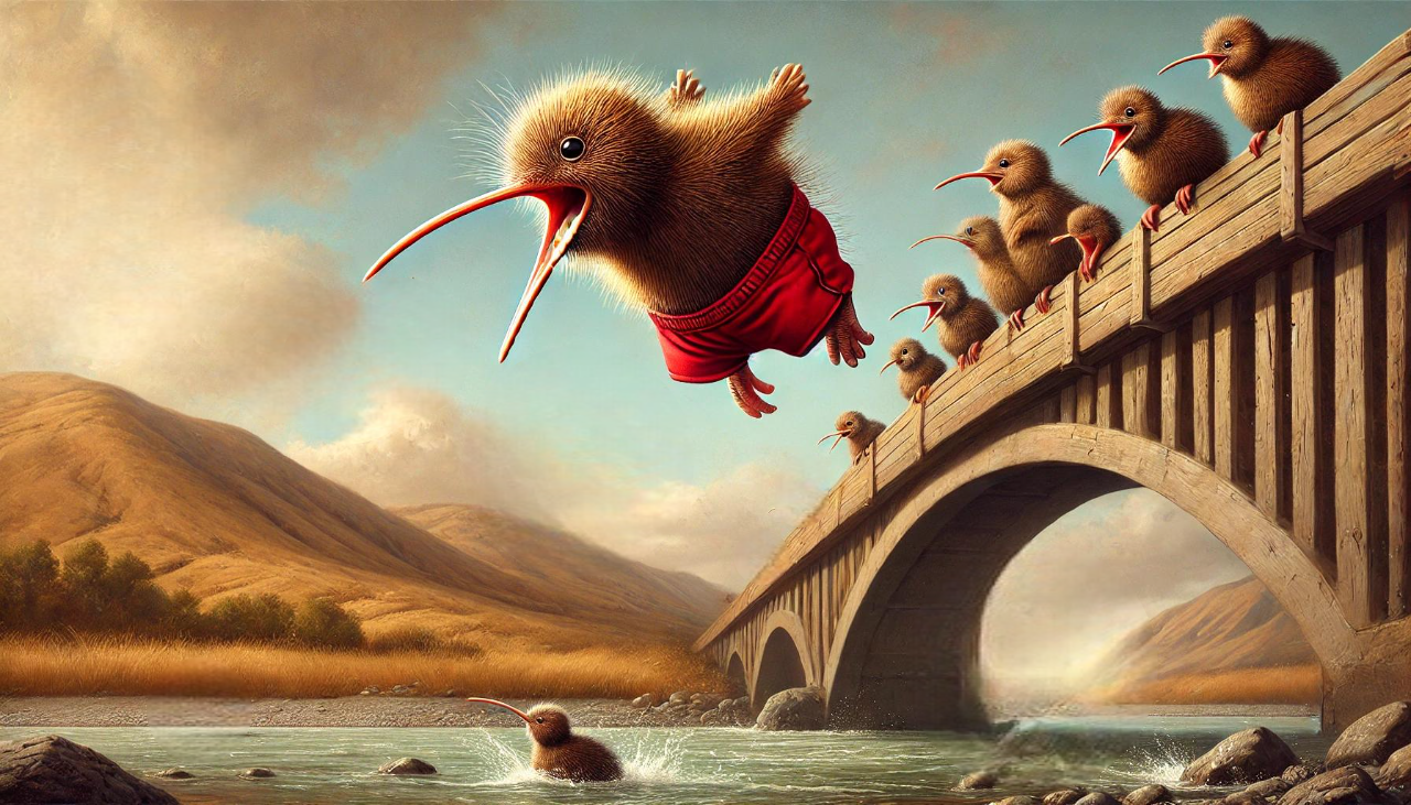 This playful matte art print captures the best of summer on the farm — a whimsical kiwi bird leaping from a wooden bridge into the cool water below. Painted in a rustic, painterly style with bright summer skies, sparkling water, and a carefree countryside mood, the artwork celebrates the humor and joy of New Zealand rural life. Perfect for farmhouse décor, summer lovers, or anyone who enjoys whimsical, storybook-style country art.