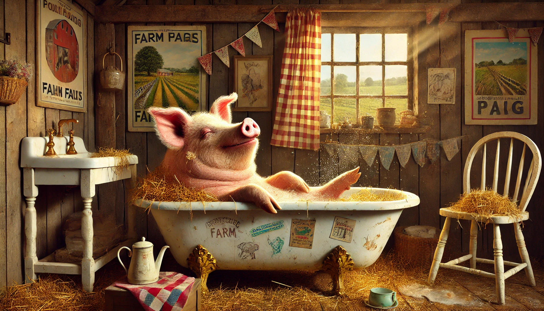 This whimsical 16x20 inch matte art print shows a pig lounging in a rustic wooden hut, happily taking a straw-filled bath — the latest craze on the farm. Painted in a humorous, painterly style with warm countryside textures and playful detail, the artwork captures the charm and comedy of New Zealand farm life. A lighthearted piece perfect for farmhouse décor, pig lovers, or anyone who enjoys funny, storybook-style barnyard art.