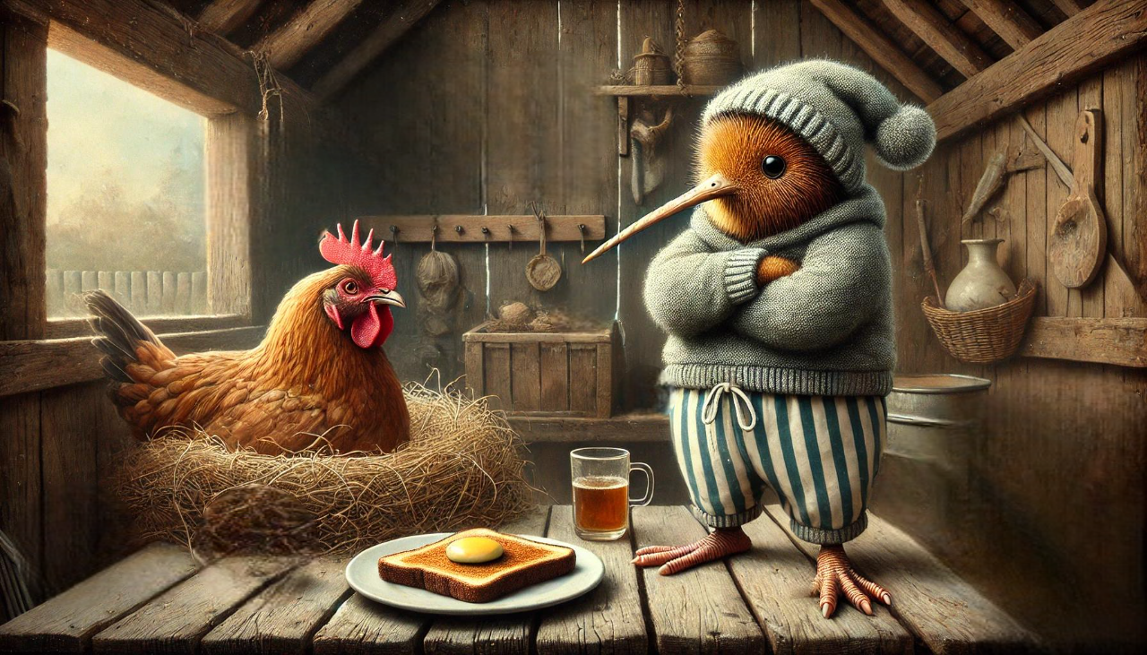 A humorous matte art print featuring a kiwi bird in its pajamas, standing with arms crossed and an impatient look while waiting for a hen to lay his breakfast egg. Painted in a rustic, painterly style with warm barnyard textures and playful detail, the artwork captures the comedy of New Zealand farm life with a storybook twist. Perfect for farmhouse décor, chicken lovers, or anyone who enjoys whimsical, country-inspired art that makes you smile.