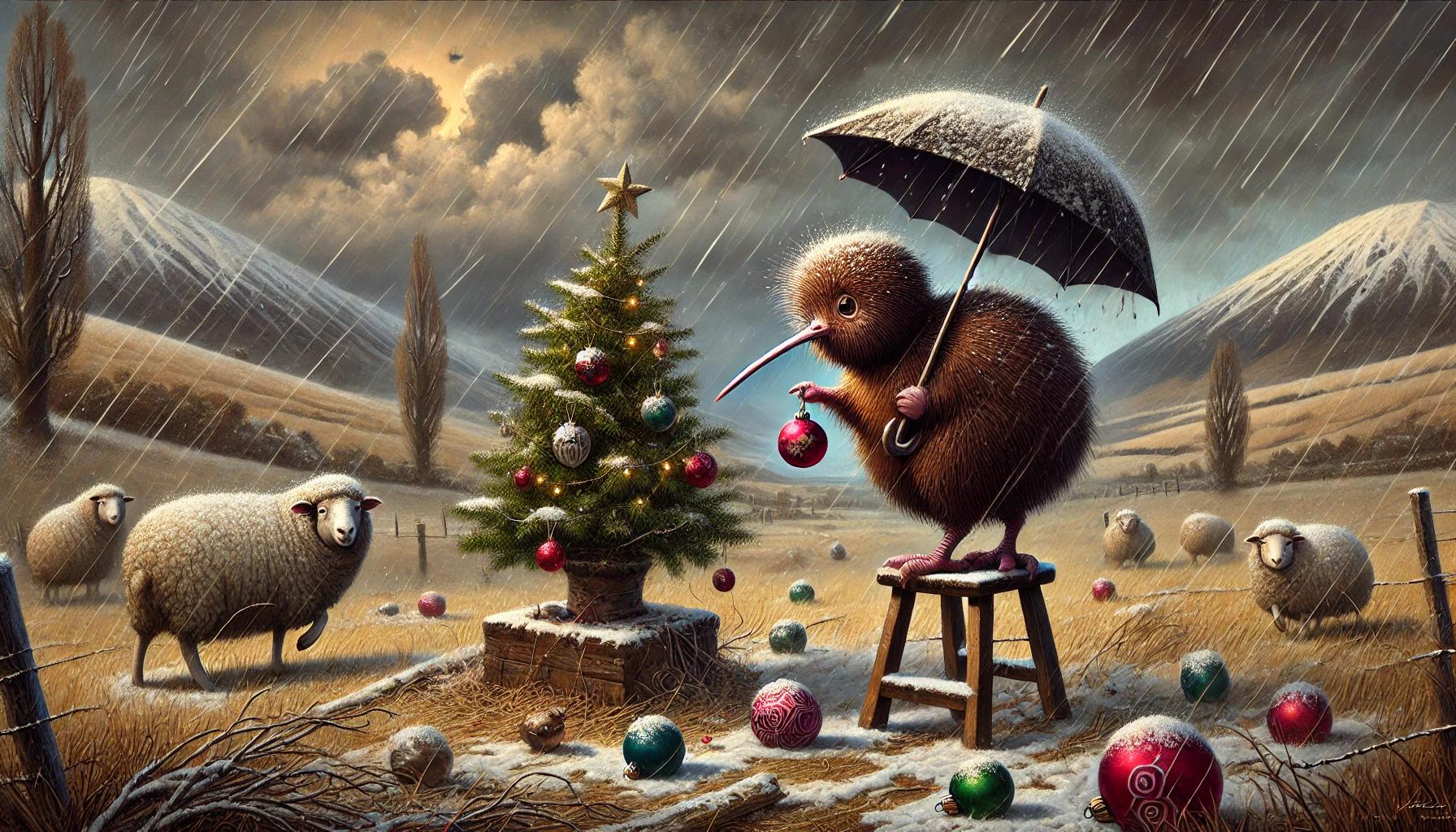 A whimsical matte art print featuring a kiwi bird decorating a Christmas tree for his flock of sheep, as bad weather rolls across the North Canterbury farm. Painted in a rustic, painterly style with darkening skies, wind-swept paddocks, and glowing festive lights on the tree, the artwork blends humor, warmth, and the resilience of New Zealand country life. A charming holiday piece, perfect for farmhouse décor, sheep lovers, or anyone who enjoys whimsical, storybook-style Christmas art with a rustic twist.