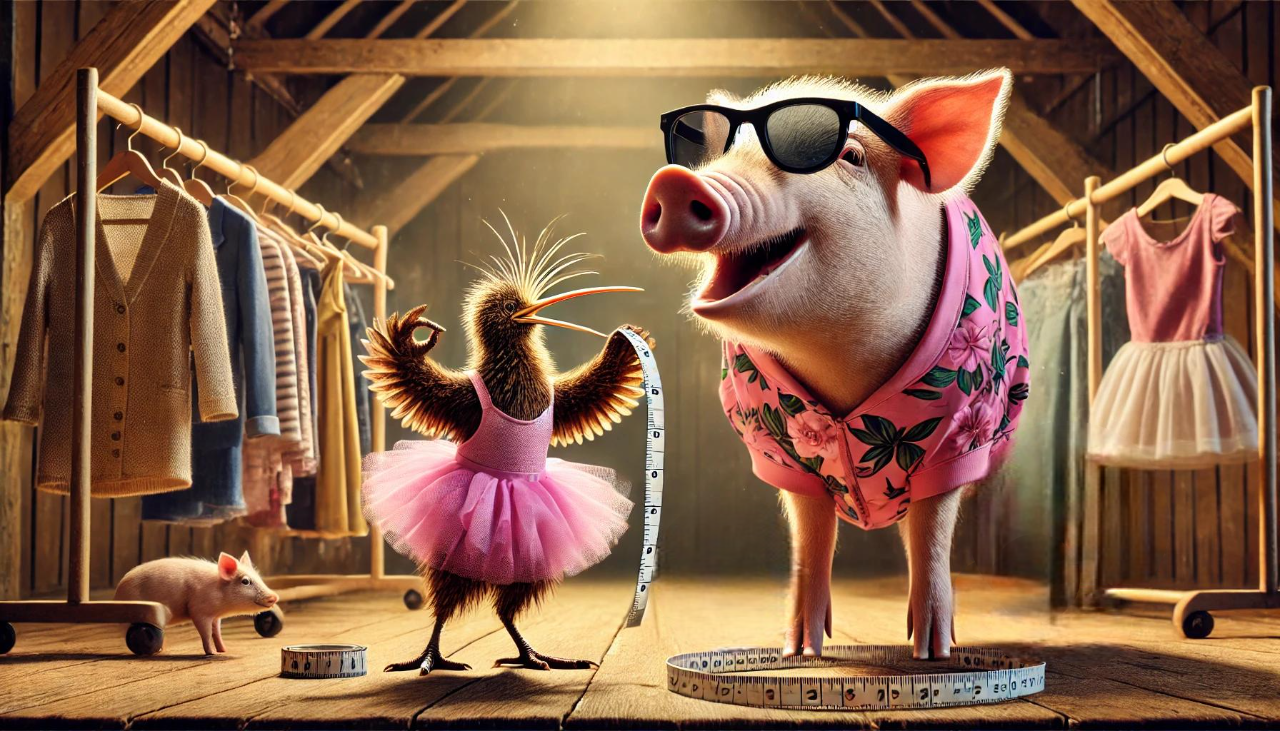 A whimsical matte art print showing a pig dressed for farm dress-up day in a bright pink Hawaiian shirt and dark sunglasses, striking a confident pose in the barnyard. Painted in a rustic, painterly style with playful detail and countryside textures, the artwork captures the humor and quirky charm of New Zealand farm life. A lighthearted storybook-style piece, perfect for farmhouse décor, pig lovers, or anyone who enjoys funny, whimsical country art.