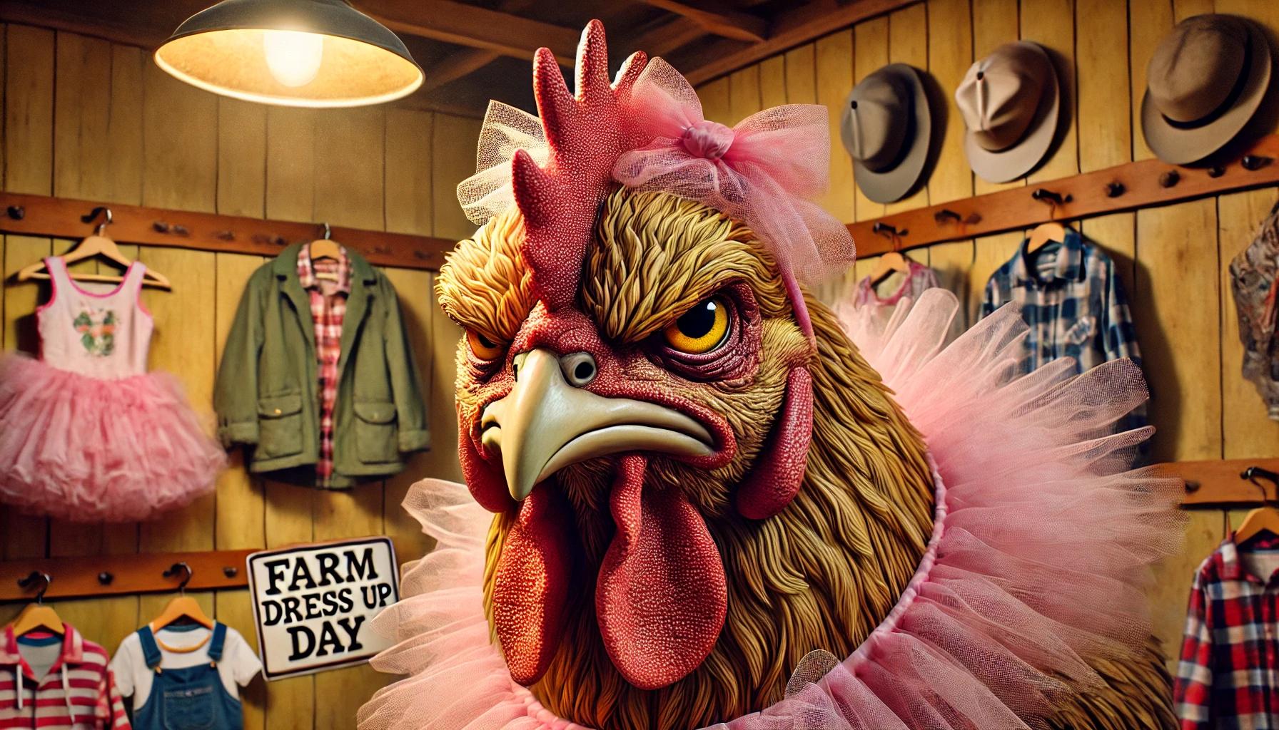 A whimsical matte art print featuring a close-up of a rooster wearing a bright pink tutu, captured with expressive detail and rustic, painterly charm. The comical barnyard portrait highlights the rooster’s unimpressed expression, blending humor and personality with the quirky side of New Zealand farm life. A playful storybook-style piece, perfect for farmhouse décor, chicken lovers, or anyone who enjoys funny, whimsical country art.