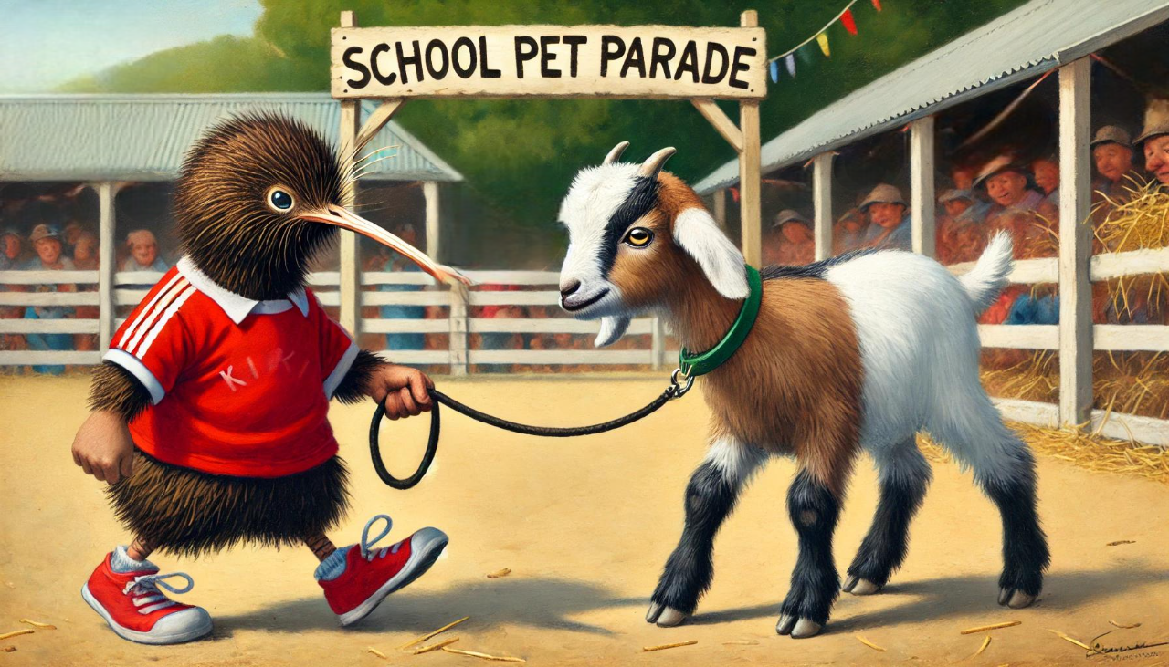 This whimsical matte art print captures the Kiwi tradition of Pet Day with a mischievous twist — a farm kid proudly tries to present his goat, who would rather nibble on the ribbons, the lead rope, or anything else within reach. Painted in a rustic, painterly style with bright countryside detail, the artwork blends humor and charm with the chaos of rural New Zealand childhood. A playful, storybook-style piece, perfect for farmhouse décor, goat lovers, or anyone who enjoys funny, whimsical farm art.