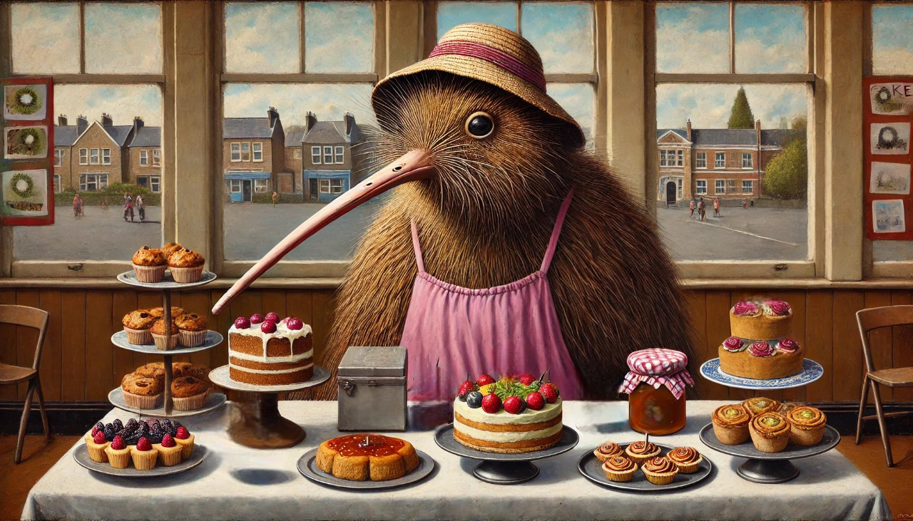 This rustic 16x20 inch matte art print captures the classic New Zealand school fundraiser, where farm wives proudly set up a country stand stacked with homemade cakes, jars of jam, and other treats. Painted in a warm, painterly style with bunting, wooden tables, and the bustle of a rural community, the artwork blends humor and nostalgia with the charm of farm traditions. A whimsical, storybook-style piece, perfect for farmhouse décor, country market lovers, or anyone who enjoys rustic, whimsical rural art.