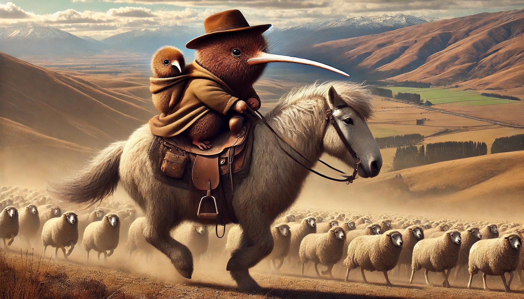 A whimsical matte art print capturing a kiwi bird riding high in the saddle with a baby kiwi tied to its back, mustering through the New Zealand high country. The rustic mountain landscape with dry, open land sets the scene for this humorous yet heartwarming farming adventure. Painted in a detailed, painterly style, the artwork blends the rugged beauty of the high country with the playful imagination of country life. Perfect for farmhouse décor, horse lovers, and anyone who enjoys funny, storybook-style New Zealand farm art.