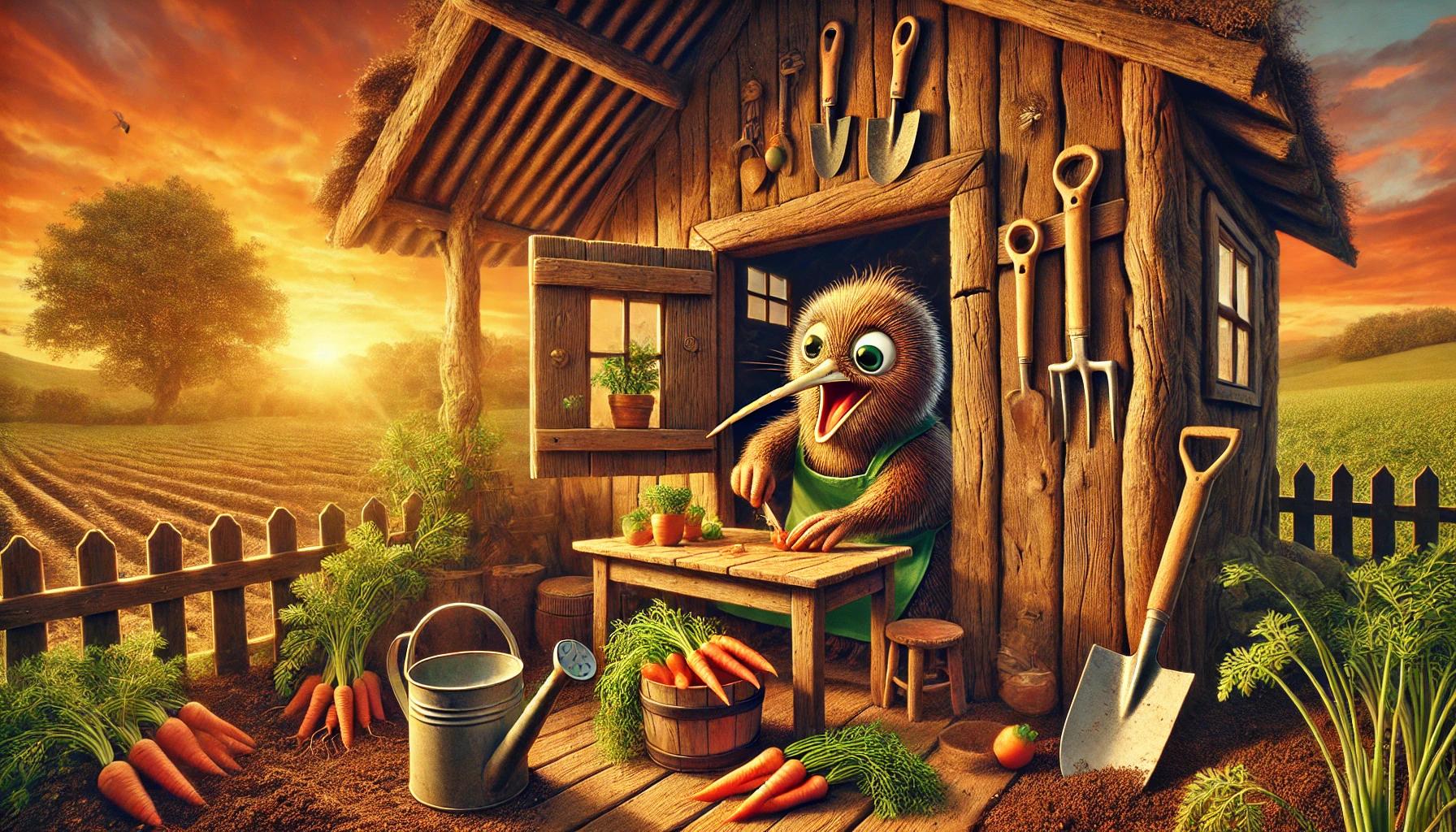 Whimsical New Zealand Bird art print featuring a Kiwi happy in his garden shed during a golden northwest sunset. The little shed glows warmly in the fading light, with tools, seed packets, and pots neatly arranged inside. The Kiwi is getting carrots ready to take inside for dinner. The sky outside is painted in rich orange and purple hues. This high-quality artwork captures the charm of simple garden pleasures, told through the character of Aotearoa’s national Bird. Perfect for Bird lovers, gardeners, art collectors, or anyone who enjoys lighthearted and imaginative seasonal art. A matte print.