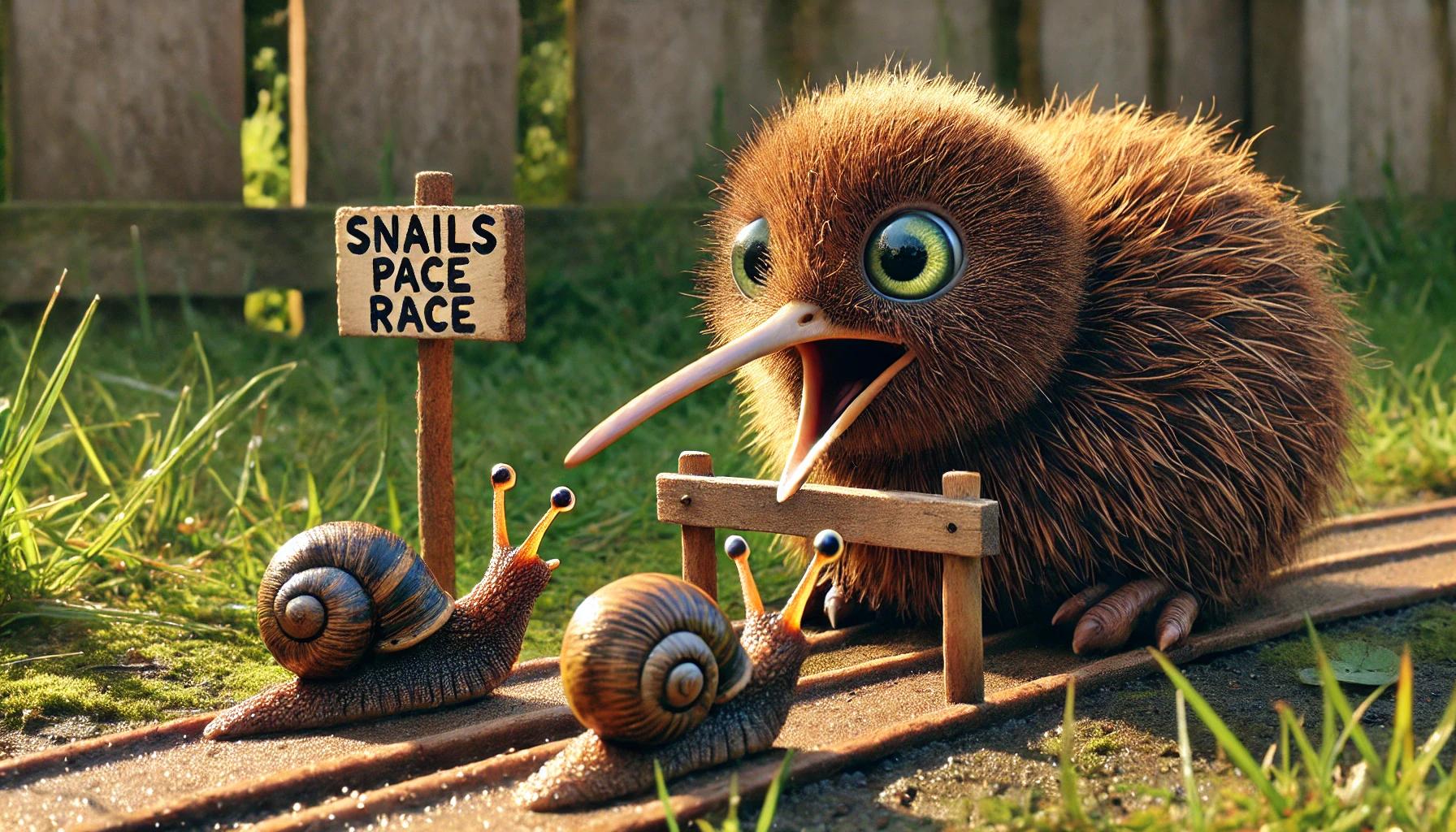 Whimsical New Zealand Bird art print featuring a Kiwi on his day off setting up a snail race in the garden. The Kiwi crouches with a look of focus and mischief as two snails line up on a little wooden track, complete with makeshift starting markers. The scene is full of humor and imagination, turning an ordinary garden day into a playful competition. This high-quality artwork captures the quirky adventures of Aotearoa’s national Bird. Perfect for Bird lovers, gardeners, art collectors, or anyone who enjoys lighthearted and funny seasonal art. A matte print.