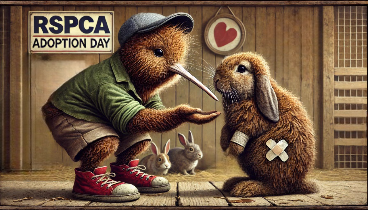Whimsical kiwi bird artwork of a gentle moment of trust. The kiwi squats low, holding out his hand with care, while a small, injured bunny stands in front of him, ears tilted back as if deciding whether to accept the gesture. Painted in a painterly, rustic, storybook style with warm woodland light and soft earthy tones this artwork captures tenderness and kindness — blending New Zealand charm with a heartfelt story of animal friendship. Matte print.