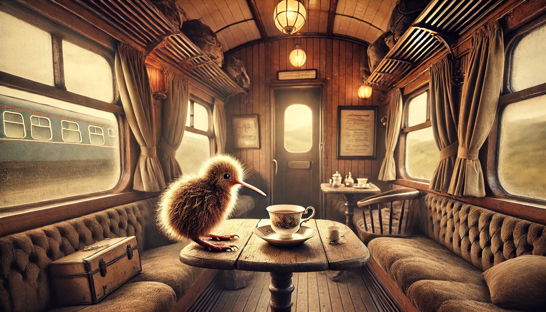 This whimsical matte art print captures Kiwi enjoying a steaming cup of tea while riding a rustic New Zealand train through the countryside. With rickety wooden seats, wide windows framing rolling hills, and a look of pure contentment on his face, Kiwi soaks up the charm of slow travel. Painted in a rustic, painterly style with storybook detail, the artwork blends humor, personality, and nostalgia with the spirit of New Zealand rail journeys. Perfect for farmhouse décor, travel lovers, or anyone who enjoys funny, whimsical Kiwi art.