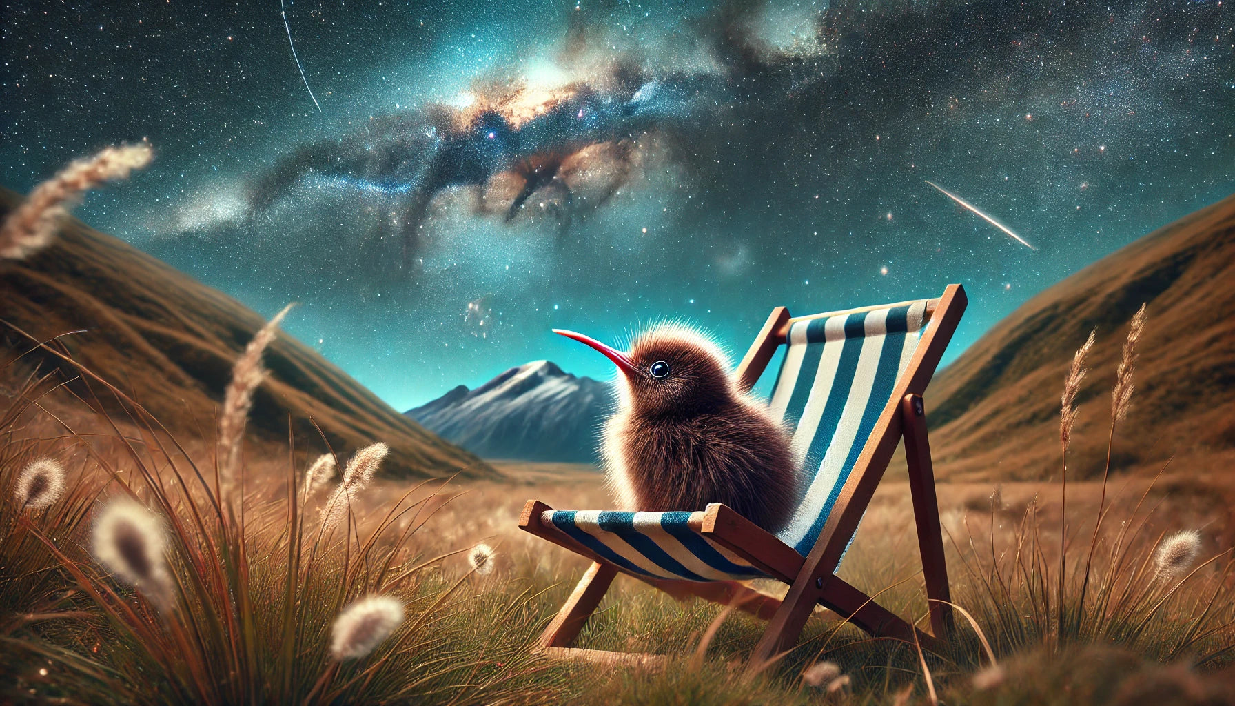 This whimsical matte art print captures Kiwi sitting quietly in a remote South Island high country valley, gazing up in amazement at the endless stars above. Painted in a rustic, painterly style with wide tussock plains, dark mountain silhouettes, and a dazzling night sky, the artwork blends wonder, humor, and personality with the magic of New Zealand’s backcountry. A dreamy storybook-style piece, perfect for farmhouse décor, stargazers, or anyone who enjoys whimsical Kiwi art inspired by nature.