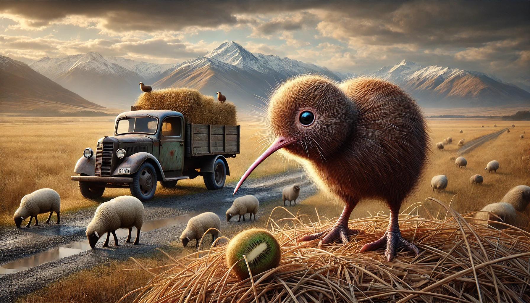 This rustic matte art print shows a whimsical kiwi bird perched proudly on a hay bale in a Canterbury farm paddock, with the majestic Southern Alps rising in the background. Painted in a painterly, storybook style with golden farmland textures, wide open skies, and playful detail, the artwork blends humor and beauty with the charm of New Zealand rural life. A lighthearted yet scenic piece, perfect for farmhouse décor, Canterbury lovers, or anyone who enjoys whimsical, country-inspired art.