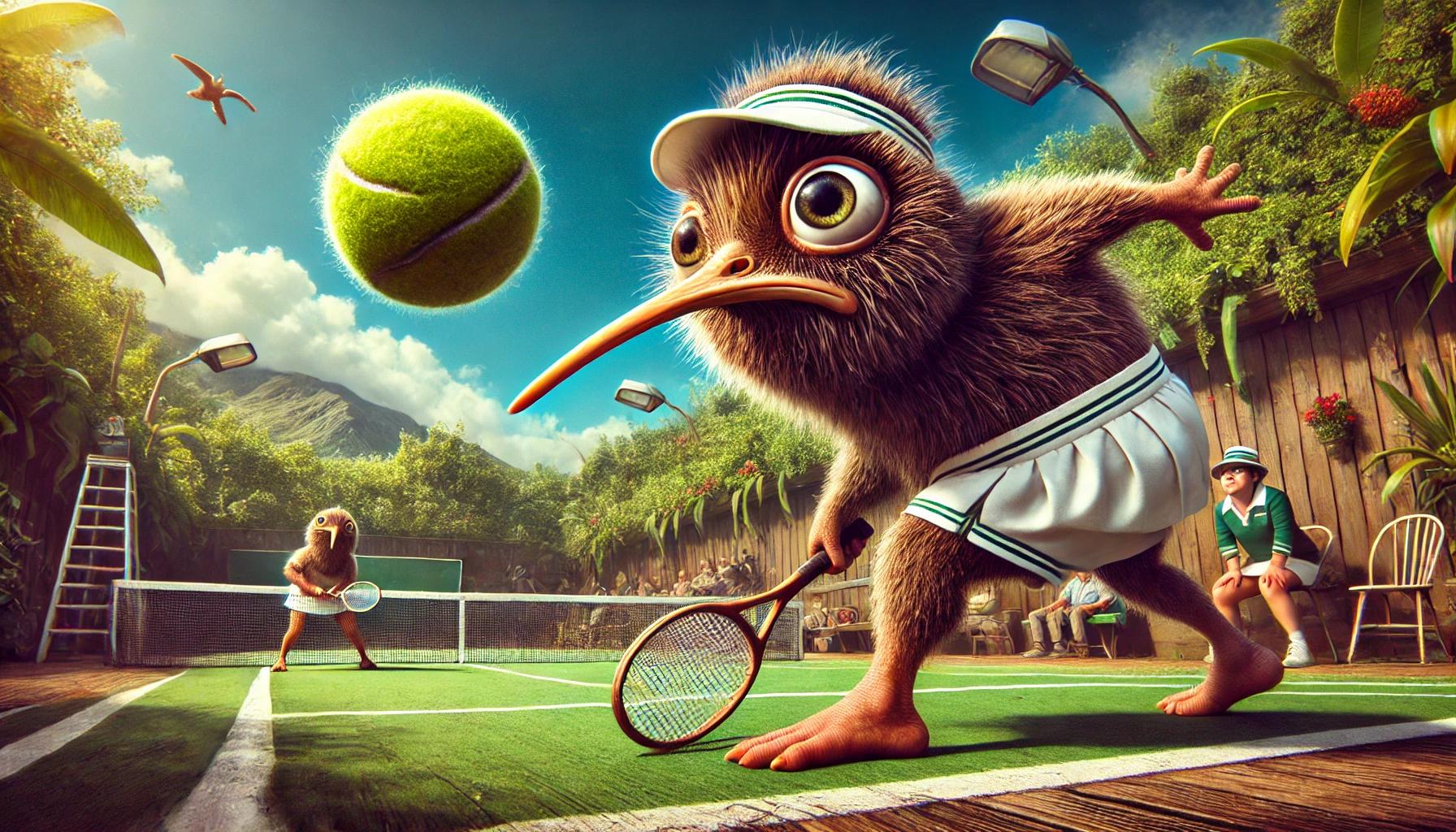Whimsical kiwi bird artwork of a playful sports scene. In a lush green garden tennis court, a kiwi attempts a tennis match with more enthusiasm than skill, his awkward swings adding humor to the setting. Painted in a painterly, rustic, and storybook style with rich garden detail, this matte print captures lighthearted charm, New Zealand character, and whimsical fun — perfect for animal lovers, sports fans, and collectors of humorous art.
