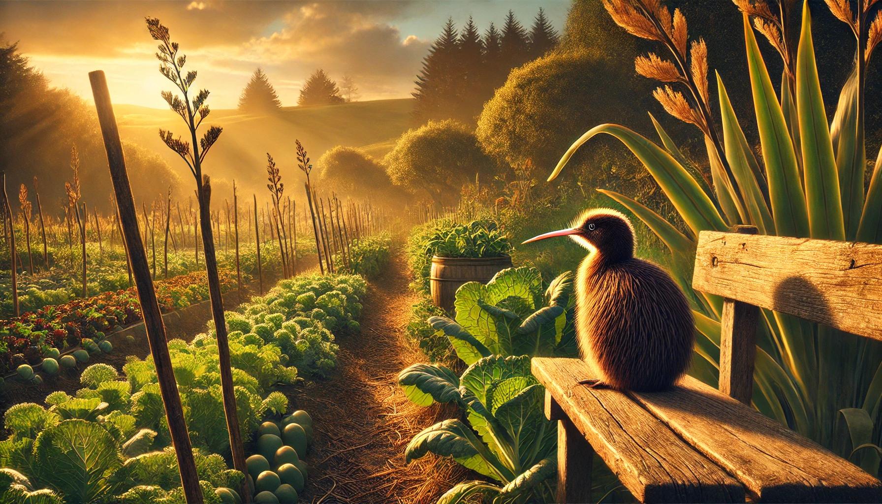 Whimsical kiwi bird artwork of a peaceful garden sunset. Sitting on a rustic wooden bench, the kiwi quietly watches his vegetables grow as golden evening light falls across the garden beds. Painted in a painterly, rustic, and storybook style with warm seasonal tones, this matte print captures New Zealand charm, homely simplicity, and whimsical humor — perfect for bird lovers, gardeners, and collectors of rustic wall décor.