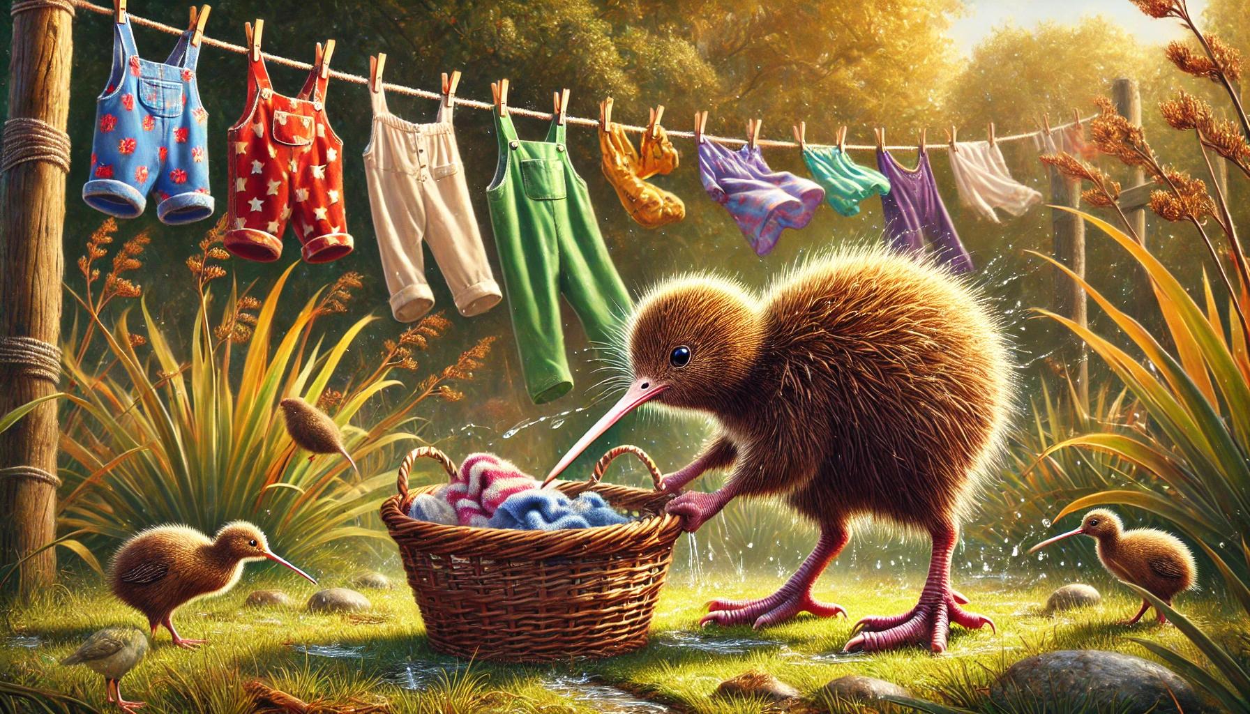 Whimsical kiwi bird illustration of a joyful New Zealand backyard moment. The kiwi hangs clothes on a rustic outdoor clothesline while children play happily nearby, laughter and movement filling the garden. Painted in a painterly, rustic, and storybook style with warm homely detail, this matte print captures family life, everyday charm, and whimsical humor — perfect for bird lovers, rustic décor fans, and collectors of heartwarming art.
