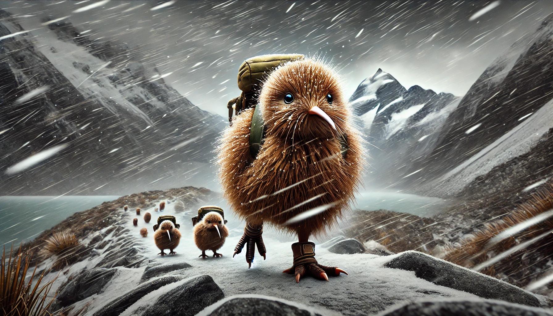 This rustic matte art print captures a determined kiwi bird tramping through the South Island high country in the middle of a snowstorm. Bundled against the cold yet pressing on through the swirling flakes, the artwork is painted in a painterly, storybook style with rugged mountain detail, icy winds, and a spirit of perseverance. A dramatic yet whimsical piece, perfect for farmhouse décor, hiking enthusiasts, or anyone who enjoys rustic, New Zealand-inspired adventure art.