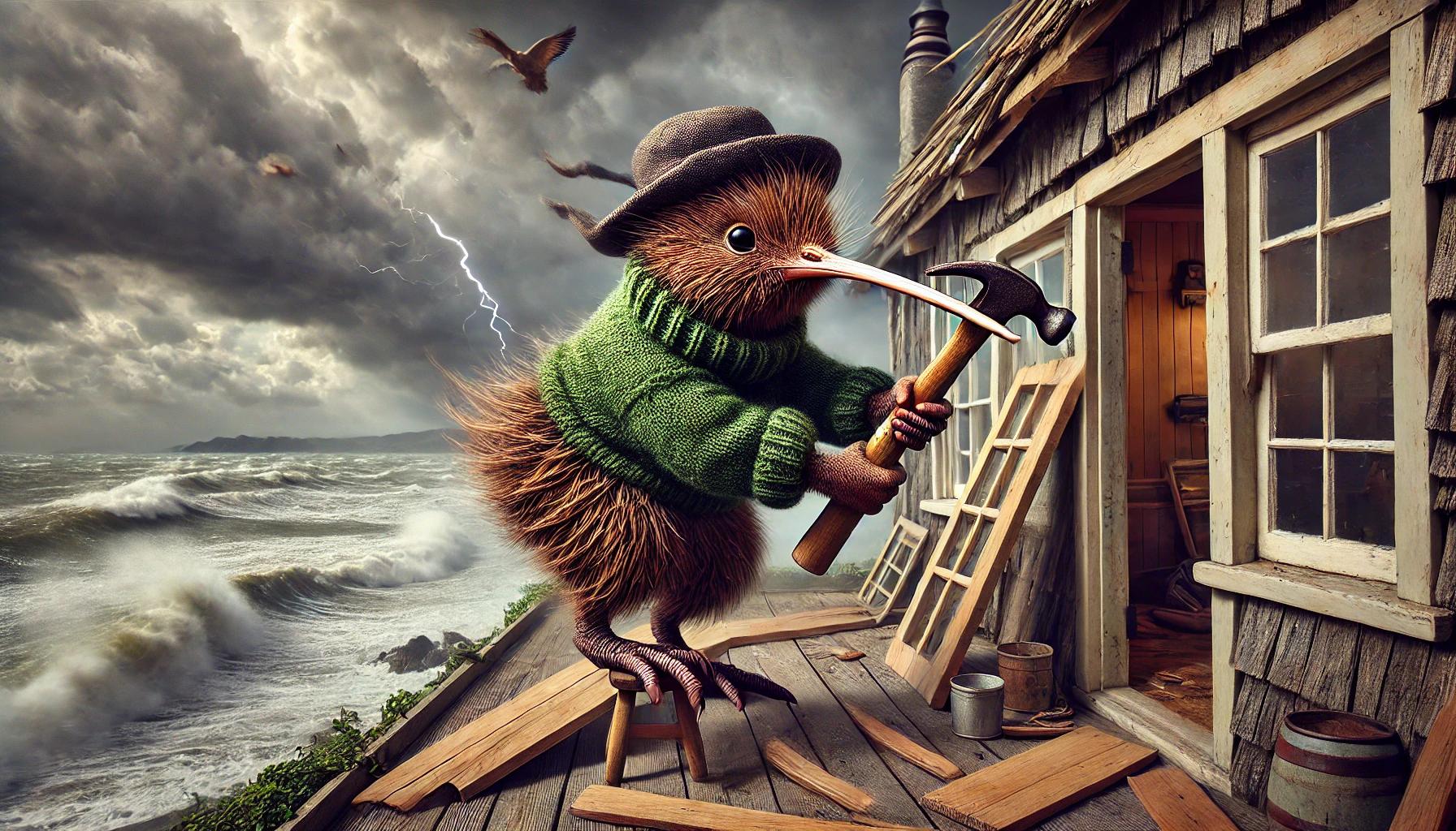 Whimsical kiwi bird artwork of coastal storm prep in New Zealand. Outside his weathered wooden seaside home, the kiwi secures windows as dark clouds roll in over the surf. Painted in a painterly, rustic, and storybook style with moody coastal atmosphere, this matte print blends adventure, resilience, and Kiwi charm — perfect for coastal décor lovers, bird enthusiasts, and collectors of whimsical art.