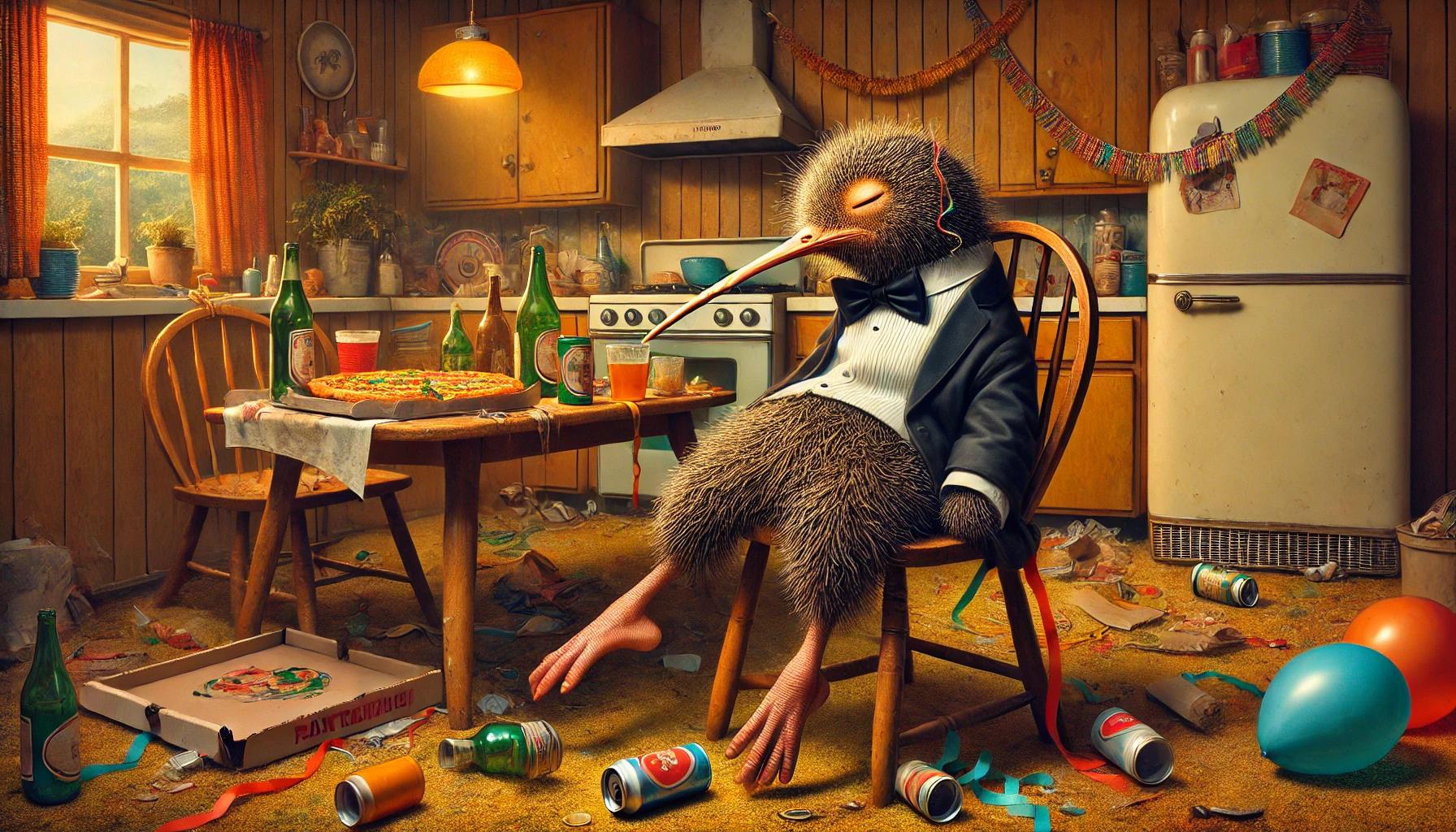Whimsical kiwi bird artwork capturing the funny aftermath of a wild birthday party. In a cluttered rustic kitchen overflowing with bottles, streamers, and scattered party décor, the kiwi slumps in a chair by the table, barely conscious after the celebration. Painted in a painterly, rustic, and storybook style with lively detail, this matte print blends humor, New Zealand charm, and lighthearted mischief — perfect for animal lovers, whimsical art fans, and collectors of humorous décor.
