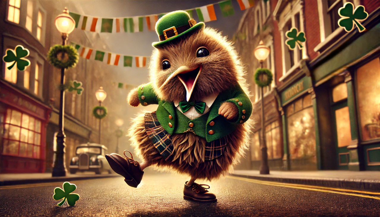Whimsical kiwi bird artwork celebrating St. Patrick’s Day. Dressed in festive green with a jaunty hat, the kiwi dances a lively jig on a cobblestone street beneath warm evening lamplight. Painted in a painterly, rustic, storybook style with soft glow and charming motion, this matte print blends Irish street-festival cheer with New Zealand character — perfect for holiday décor, Irish heritage lovers, and whimsical art collectors.