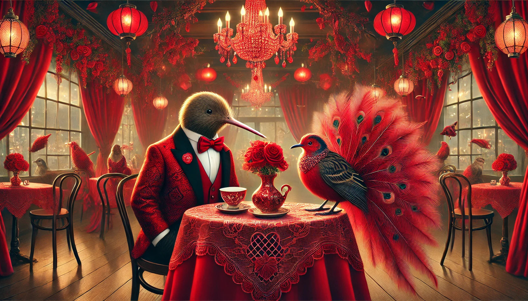 Whimsical kiwi bird artwork set in a romantic French restaurant on Valentine’s Day. The kiwi sits at a candlelit table, looking dapper in his smart red suit, while his dinner guest, a bird with brilliant plumes of red, brightens the cozy scene. Painted in a painterly, rustic, storybook style with warm, glowing light and rich color, this matte print blends New Zealand charm with Parisian romance — perfect for whimsical art lovers and Valentine’s décor.