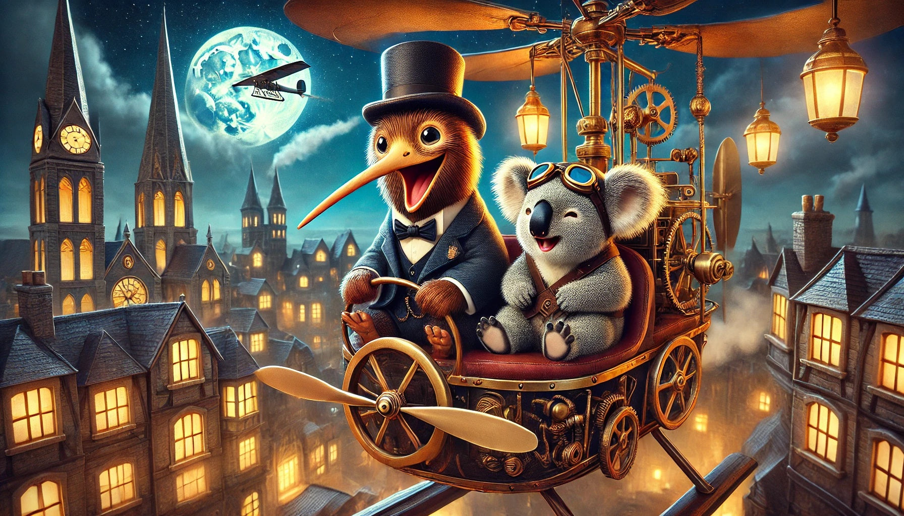 Whimsical kiwi bird artwork of a magical steampunk voyage. Wearing brass goggles and patched leather gear, the kiwi pilots a fantastical helicopter across the skies of Europe, gears whirring and steam drifting in the night air. Beside him, his koala friend gazes out in wonder, ears tufted and eyes wide with delight. Painted in a painterly, rustic, storybook style with glowing lamps, intricate metalwork, and sweeping city skylines below, this matte print blends New Zealand charm with steampunk fantasy — perfect for whimsical art lovers and fans of imaginative travel scenes.