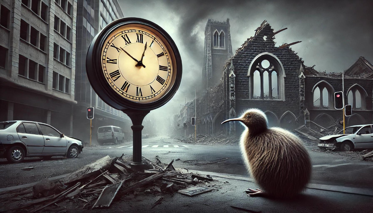 Whimsical yet deeply reflective kiwi bird artwork commemorating the Christchurch earthquake. The kiwi stands quietly in Cathedral Square his small figure set against the damaged silhouette of the Christchurch Cathedral. Around him, broken bricks and fallen timbers are touched by shafts of soft light, symbolizing both loss and resilience. Painted in a painterly, rustic, storybook style with muted tones and a reverent atmosphere. This matte print blends New Zealand charm with solemn remembrance — a tribute to endurance, memory, and hope.
