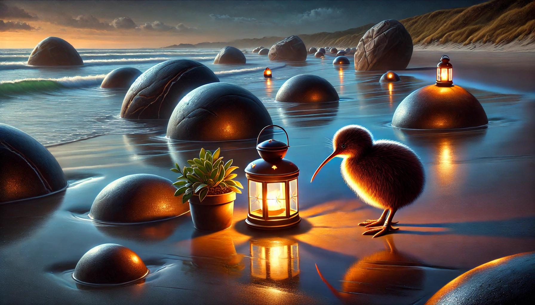 A painterly matte print featuring a kiwi bird standing among the famous Moeraki Boulders on New Zealand’s South Island. Moonlight glows across the smooth, spherical rocks and glistening shoreline, while the night sky and gentle waves create a scene both magical and serene. Whimsical yet hyper-realistic, this artwork blends one of New Zealand’s most iconic coastal landmarks with the quiet presence of its beloved national bird. Perfect for kiwi lovers, landscape art admirers, and collectors of New Zealand-inspired décor.
