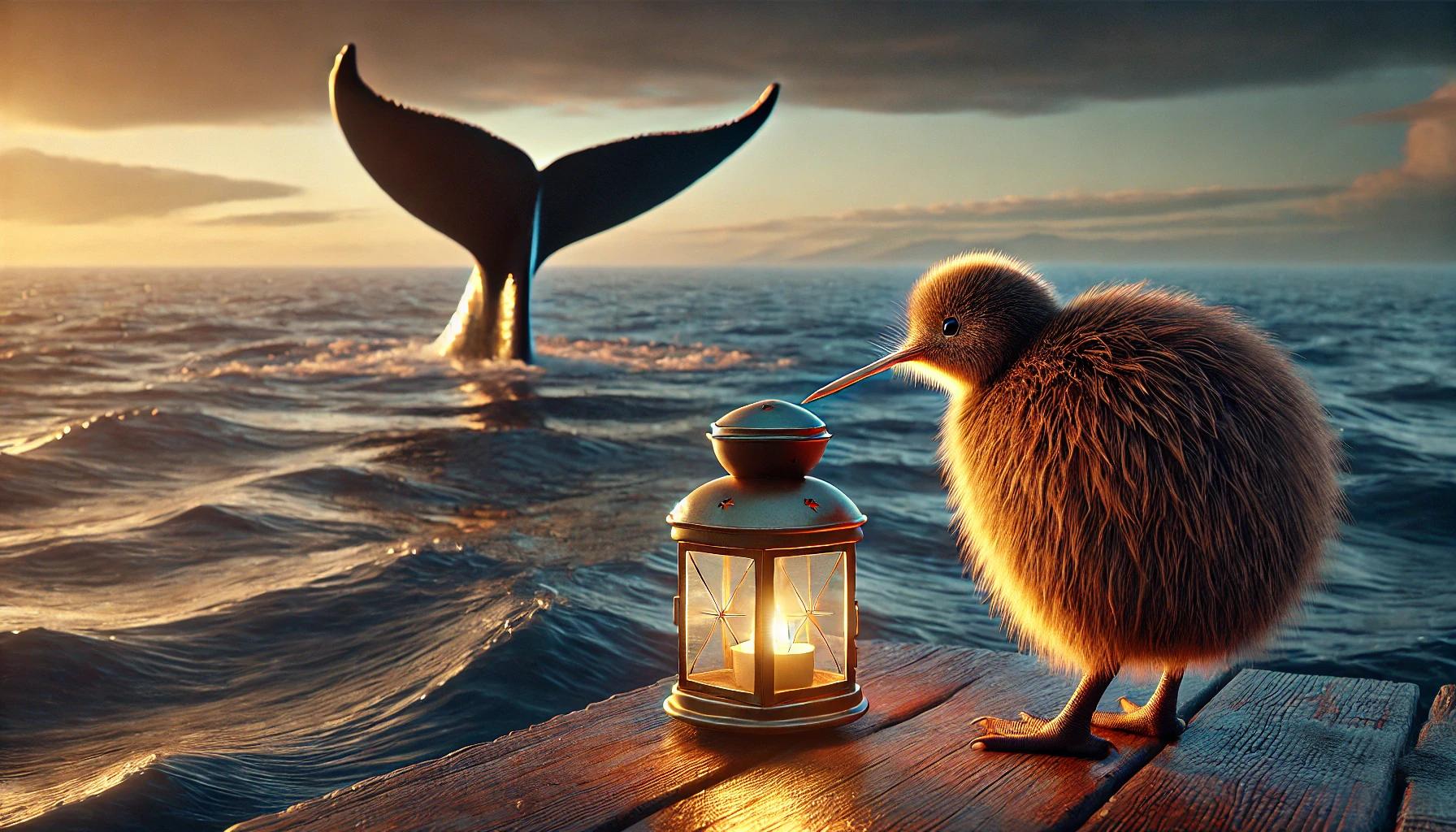 Watching the Whale – Kiwi Trails Art Print – A painterly matte print featuring a kiwi bird standing on a wooden dock, gazing out at a whale surfacing just offshore. The great tail arcs above the water, while the tiny kiwi looks on in awe. Whimsical yet hyper-realistic, this artwork captures the grandeur of New Zealand’s marine life contrasted with the humble presence of its most iconic bird. Perfect for kiwi lovers, whale enthusiasts, and collectors of New Zealand-inspired seascape art.