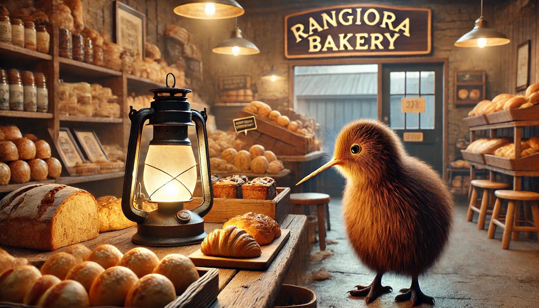 Bakery with Golden Rolls – Kiwi Trails Art Print – A painterly matte print featuring a kiwi bird inside a classic New Zealand bakery, surrounded by trays of freshly baked golden rolls. The soft glow of the shop lights highlights the crisp crusts and flour-dusted counters, filling the scene with warmth and homely comfort. Whimsical yet hyper-realistic, this artwork captures the charm of small-town bakeries through the gentle presence of New Zealand’s most iconic bird. Perfect for kiwi lovers, food enthusiasts, and collectors of New Zealand-inspired lifestyle art.