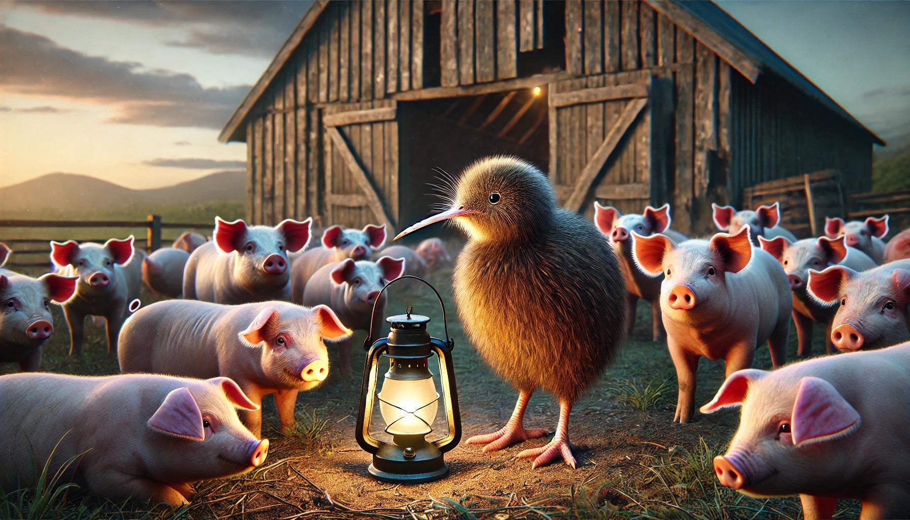 Out in the Field with the Pigs – Kiwi Trails Art Print – A painterly matte print featuring a kiwi bird wandering through a New Zealand paddock alongside a group of pigs. The pigs root about happily in the grass as the soft evening light glows across the rolling farmland, creating a warm and humorous rural scene. Whimsical yet hyper-realistic, this artwork blends the everyday life of New Zealand farms with the gentle charm of its most iconic bird. Perfect for kiwi lovers, pig enthusiasts, and collectors of New Zealand-inspired countryside art.