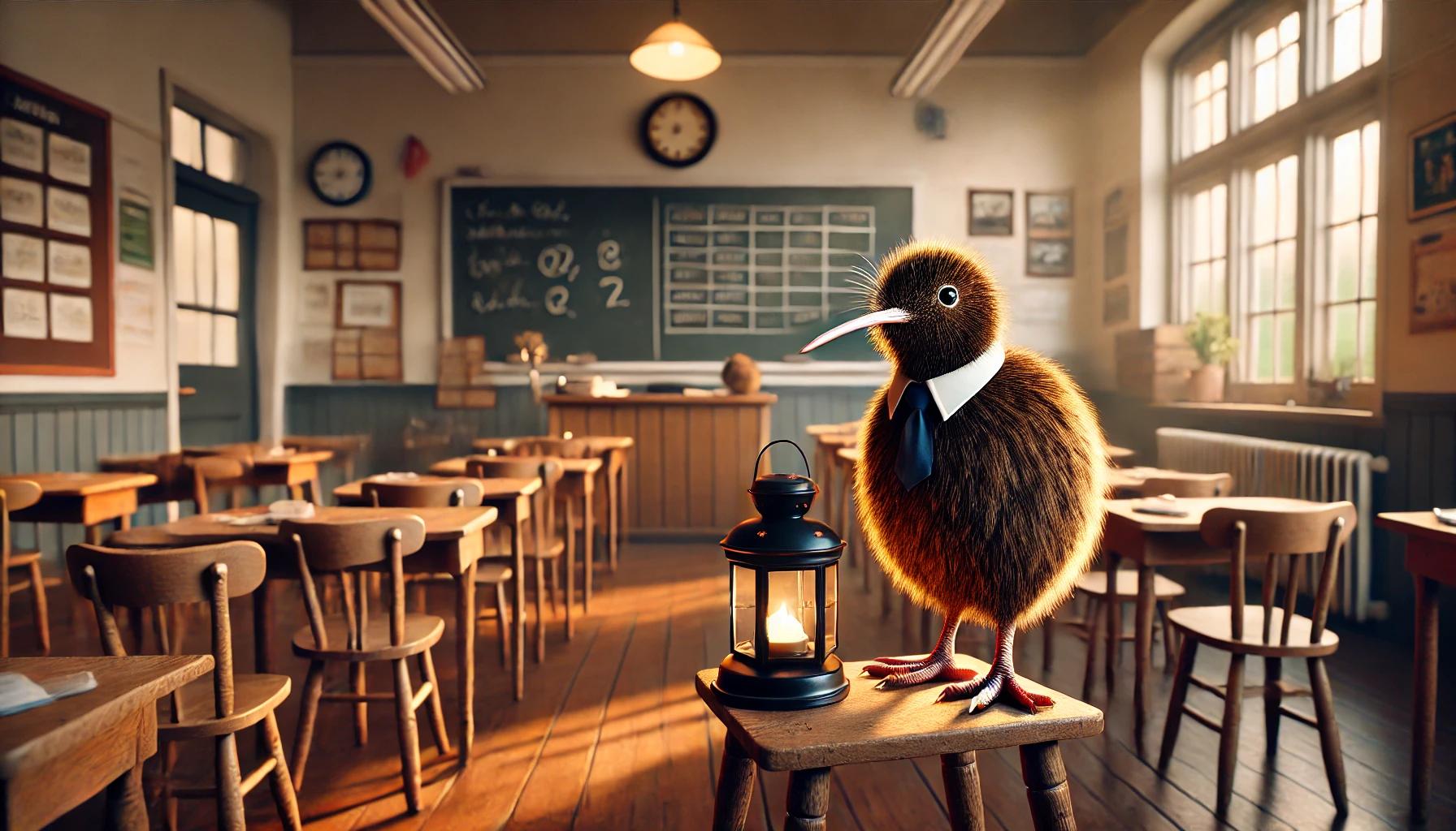 Rustic School Room – Kiwi Trails Art Print – A painterly matte print featuring a kiwi bird inside a rustic New Zealand school room. Wooden desks, chalkboard walls, and worn floorboards set the scene, while sunlight filters through tall windows, filling the space with quiet character. Whimsical yet hyper-realistic, this artwork blends the history of rural schooling with the gentle presence of New Zealand’s most iconic bird. Perfect for kiwi lovers, history enthusiasts, and collectors of New Zealand-inspired heritage art.