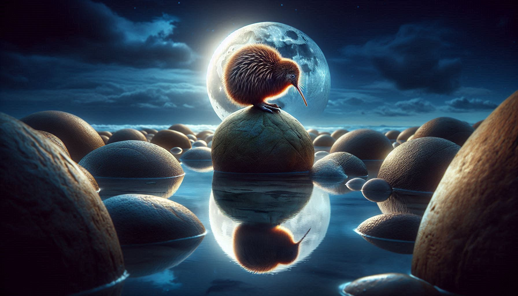Unique New Zealand art print featuring a kiwi bird perched on boulders similar to those found near Dunedin. This matte print is painted in a highly detailed, painterly style, blending the quiet mystery of the southern coastline with the iconic presence of New Zealand’s national bird. The moonlit waves glisten in the background as the kiwi stands in silhouette and glow, creating a distinctive and atmospheric piece of high-quality wildlife art. Perfect for bird lovers, New Zealanders, or anyone who collects unique and whimsical coastal artwork.