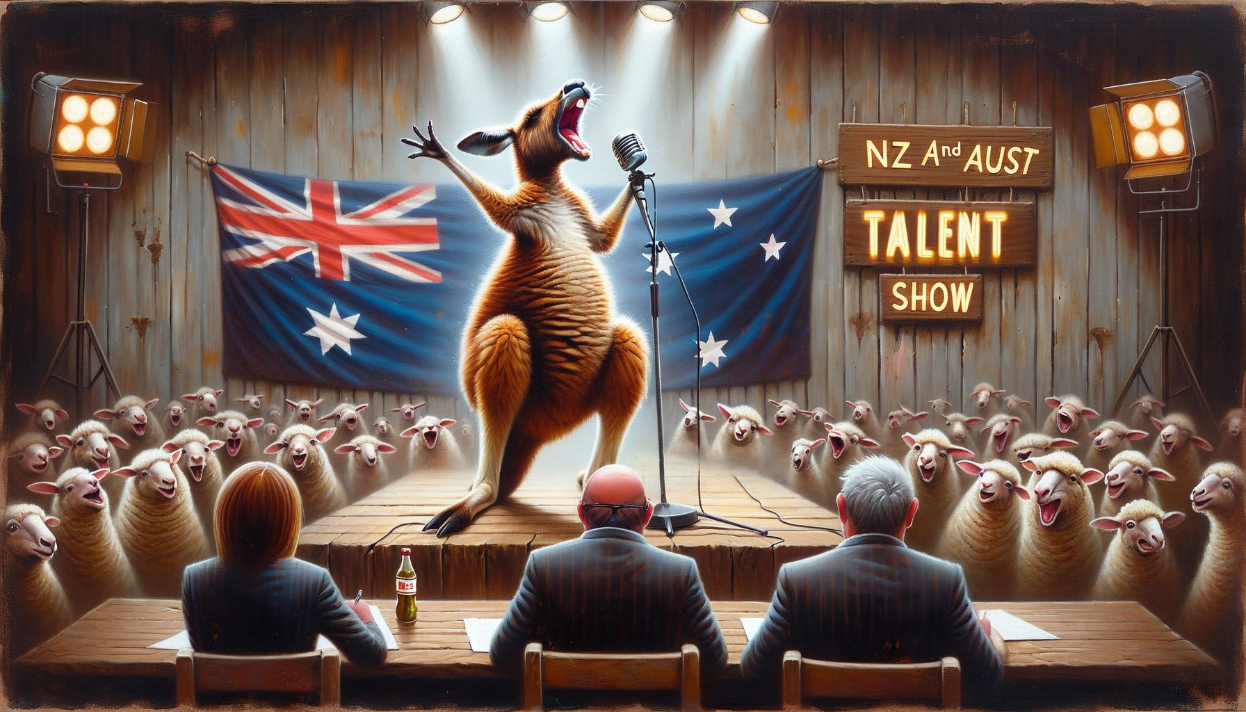 A matte print. Bathed in a single spotlight, a kangaroo clutches the microphone with both paws, eyes closed and face lifted in raw emotion as it pours its heart into a power ballad. Its voice seems to fill the rustic theatre, leaving the audience hushed and wide-eyed. The intensity of its performance contrasts comically with the seriousness of the scene — a kangaroo transformed into a dramatic vocalist, rivaling any human diva. Painterly detail captures every flicker of feeling, from the crease of its brow to the curve of its stance, making this a whimsical highlight of the Trans-Tasman talent show.