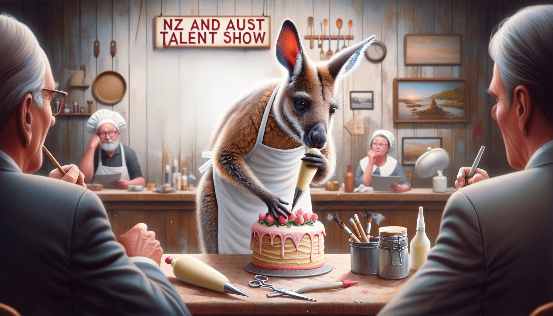 A matte print. On the brightly lit stage, a kangaroo works on her masterpiece — an elaborately decorated cake covered with swirls of cream and perfectly arranged fruit. In the foreground, a panel of human judges sit at a rustic wooden table, making notes and watching with a mix of skepticism, curiosity, and quiet admiration. The painterly detail captures the tension and humor of the moment, blending culinary flair with the playful spirit of the Trans-Tasman rivalry talent show.