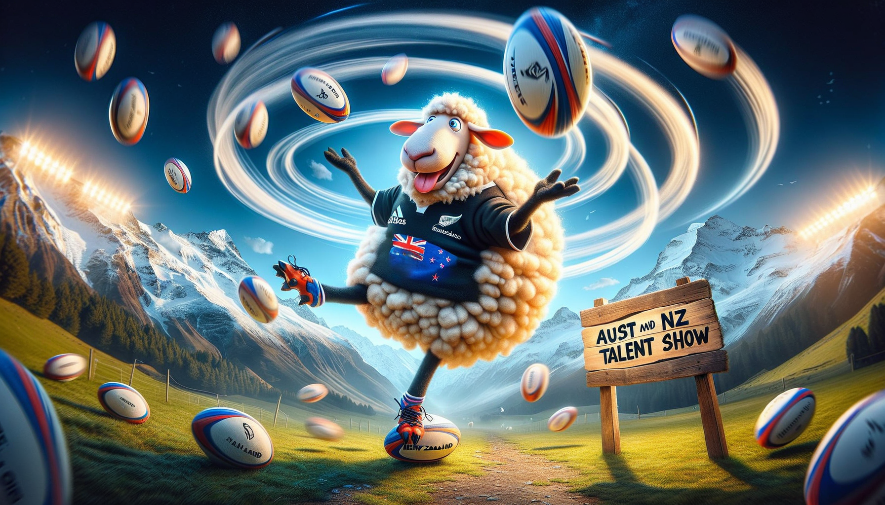 This matte print captures a whimsical performance as a sheep, dressed smartly in a classic black vest, juggles rugby balls against the breathtaking mountain scenery of New Zealand. The alpine peaks rise majestically in the background, touched with snow and glowing light, while the sheep balances confidently. The rugby balls soar in graceful arcs through the crisp mountain air, turning a rustic sporting act into a charming storybook spectacle. Painterly detail highlights both the humor and pride of this Trans-Tasman rivalry moment.
