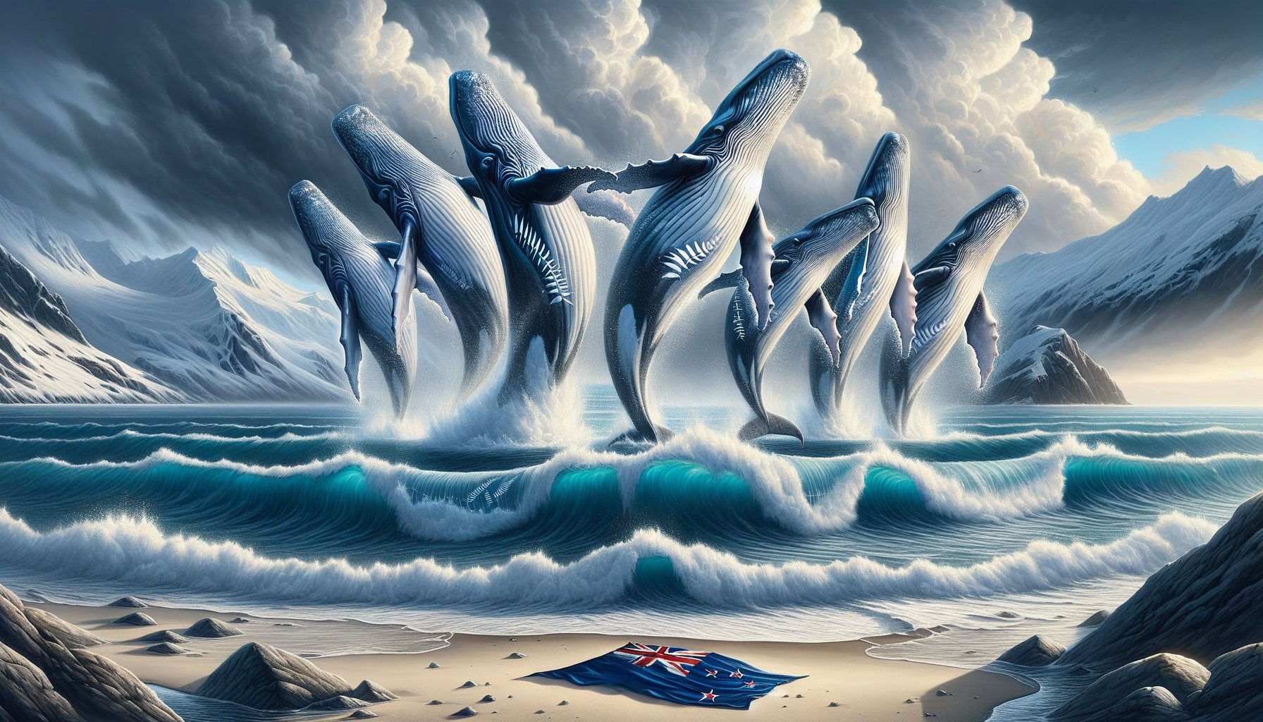 In a breathtaking display, a pod of whales performs synchronized swimming off the rugged New Zealand coast. Their massive forms arc gracefully out of the glittering water, leaping in perfect unison against a backdrop of towering mountains touched with snow and golden light. The sea sprays upward in dazzling bursts. Painterly detail captures the grandeur of the scenery and the whimsy of the performance, turning the Trans-Tasman rivalry talent show into a natural wonder. This artwork is available as a 16 x 20 inch matte print.