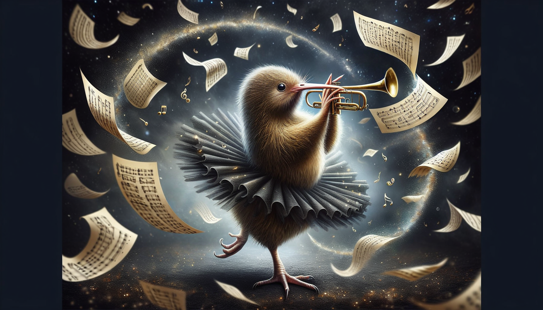 Against a deep black background, a kiwi stands proudly, playing a gleaming brass horn with bright, determined eyes. Around the bird, sheets of music swirl dramatically in the air, caught in an invisible current that seems to dance with the melody. The stark backdrop highlights the kiwi’s feathers and the instrument’s shine, giving the performance a theatrical, almost magical quality. Painterly detail adds both elegance and whimsy, making this a striking centerpiece in the Trans-Tasman talent show. This artwork is available as a matte print.