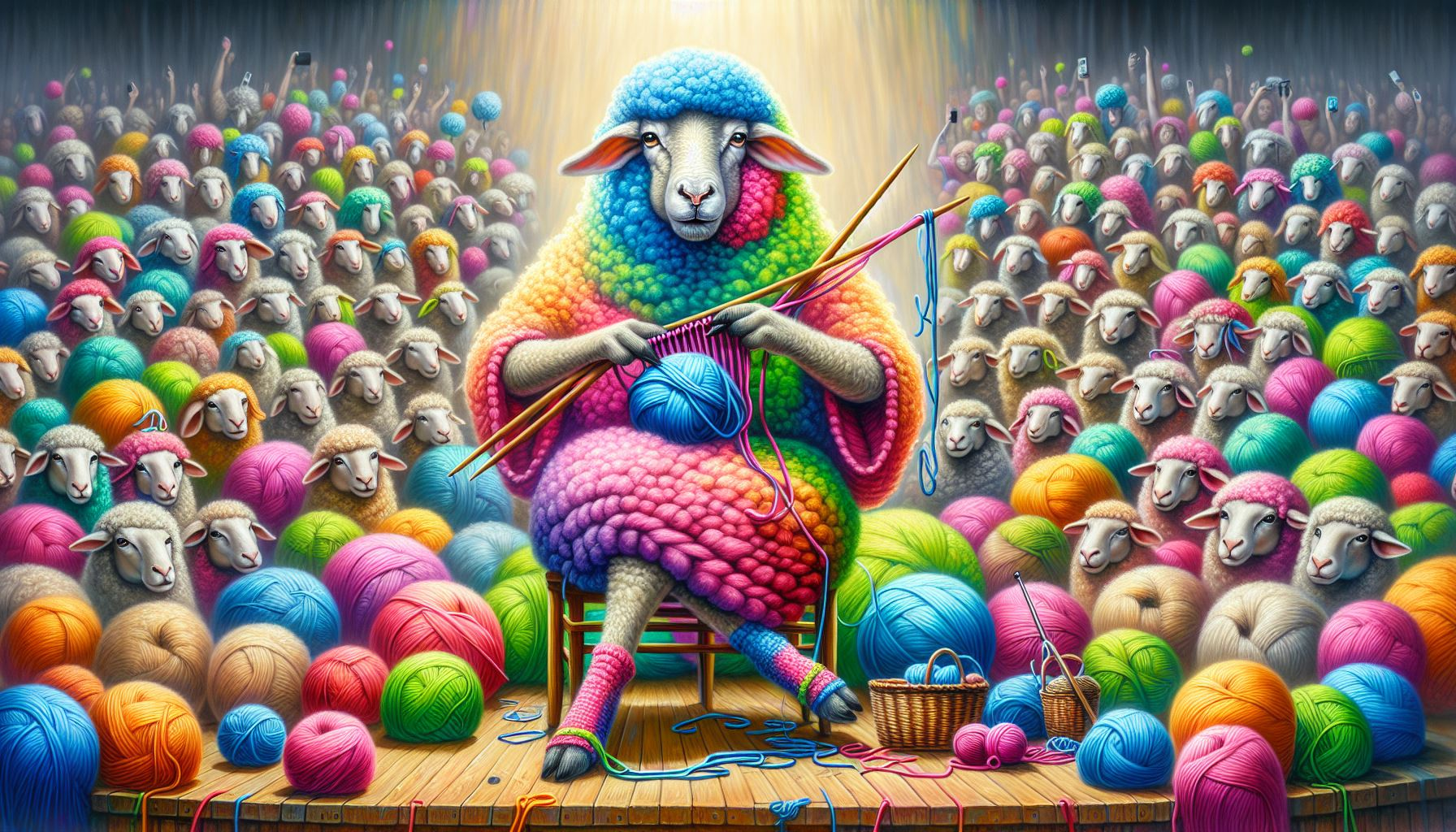 On a brightly lit stage, an enormous sheep takes center spotlight, calmly knitting its own wool into a dazzling tapestry of vibrant colors. Bright skeins of yarn spill across the rustic floor, forming wild loops and patterns as the sheep works steadily with oversized needles. Its expression is serene, almost meditative, while the audience looks on in awe at the bizarre and brilliant act. Painterly detail heightens the humor and wonder, transforming the Trans-Tasman rivalry into a surreal showcase of creativity. This artwork is available as a matte print.